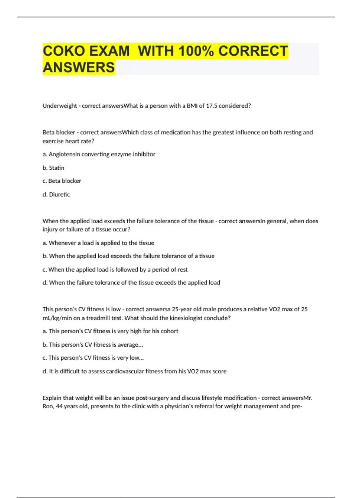 Underweight - correct answersWhat is a person with a BMI of 17.5 considered? Beta blocker - correct answersWhich class of medication has the greatest influence on both resting and exercise heart rate? a. Angiotensin converting enzyme inhibitor b. Statin c. Beta blocker d. Diuretic When the applied load exceeds the failure tolerance of the tissue - correct answersIn general, when does injury or failure of a tissue occur? a. Whenever a load is applied to the tissue b. When the applied load exceeds the failure tolerance of a tissue c. When the applied load is followed by a period of rest d. When the failure tolerance of the tissue exceeds the applied load This person's CV fitness is low - correct answersa 25-year old male produces a relative VO2 max of 25 mL/kg/min on a treadmill test. What should the kinesiologist conclude? a. This person's CV fitness is very high for his cohort b. This person's CV fitness is average... c. This person's CV fitness is very low... d. It is difficult to assess cardiovascular fitness from his VO2 max score Explain that weight will be an issue post-surgery and discuss lifestyle modification - correct answersMr. Ron, 44 years old, presents to the clinic with a physician's referral for weight management and pre-anthroscopic knee surgery strengthening. Mr. Ron is 103.6kg with 30% BF, on a 168 cm frame and a weekend athlete. What should the kinesiologist do? a. Tell him to lose some weight before surgery and drop calories by 1,000 per day b. Explain that weight will be an issue post-surgery and discuss lifestyle modification c. Suggest that he start a high-intensity plyometric program