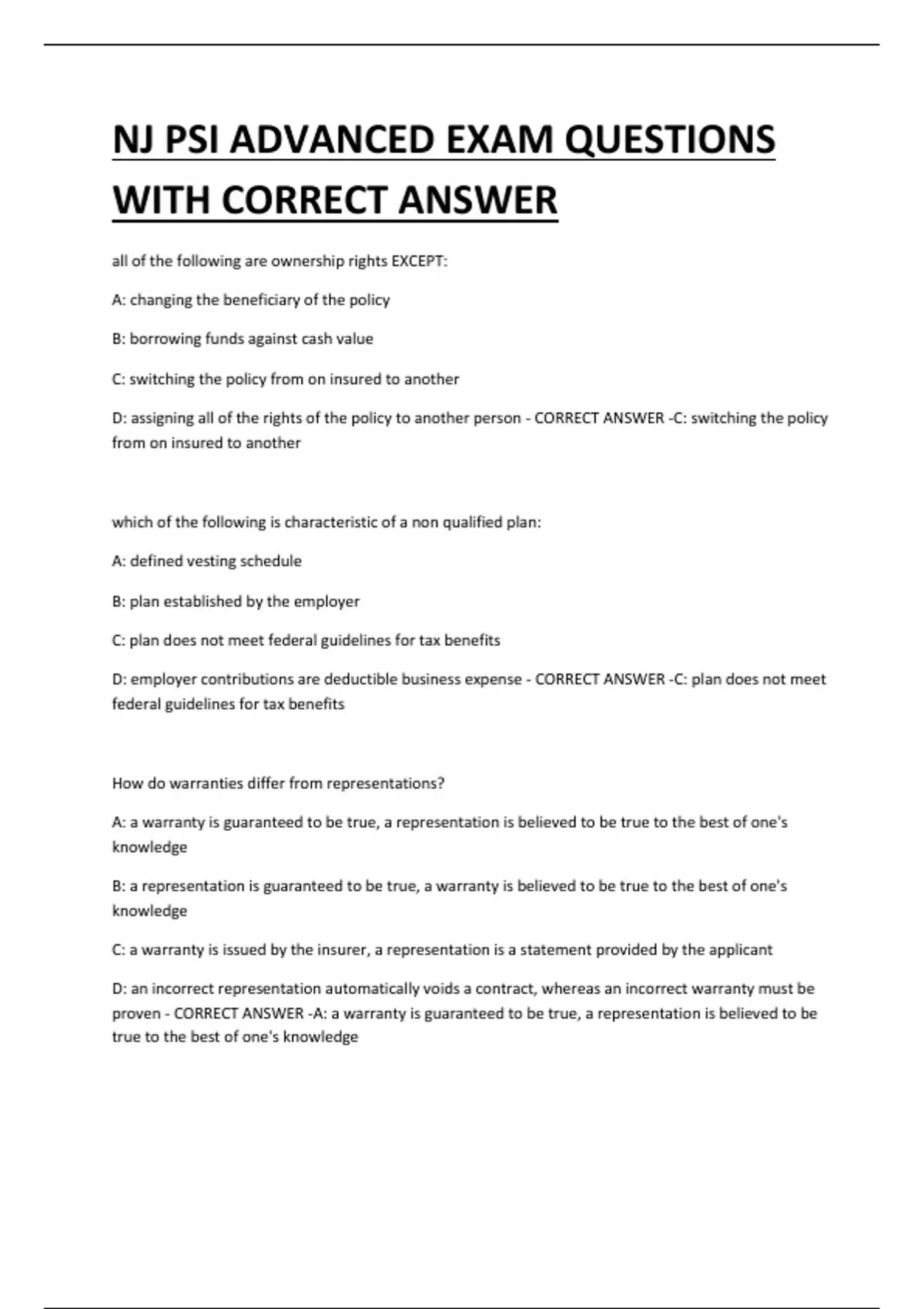 NJ PSI ADVANCED EXAM QUESTIONS WITH CORRECT ANSWER all of the following are ownership rights EXCEPT: A: changing the beneficiary of the policy B: borrowing funds against cash value C: switching the policy from on insured to another D: assigning all of the rights of the policy to another person - CORRECT ANSWER -C: switching the policy from on insured to another which of the following is characteristic of a non qualified plan: A: defined vesting schedule B: plan established by the employer C: plan does not meet federal guidelines for tax benefits D: employer contributions are deductible business expense - CORRECT ANSWER -C: plan does not meet federal guidelines for tax benefits How do warranties differ from representations? A: a warranty is guaranteed to be true, a representation is believed to be true to the best of one's knowledge B: a representation is guaranteed to be true, a warranty is believed to be true to the best of one's knowledge C: a warranty is issued by the insurer, a representation is a statement provided by the applicant D: an incorrect representation automatically voids a contract, whereas an incorrect warranty must be proven - CORRECT ANSWER -A: a warranty is guaranteed to be true, a representation is believed to be true to the best of one's knowledge