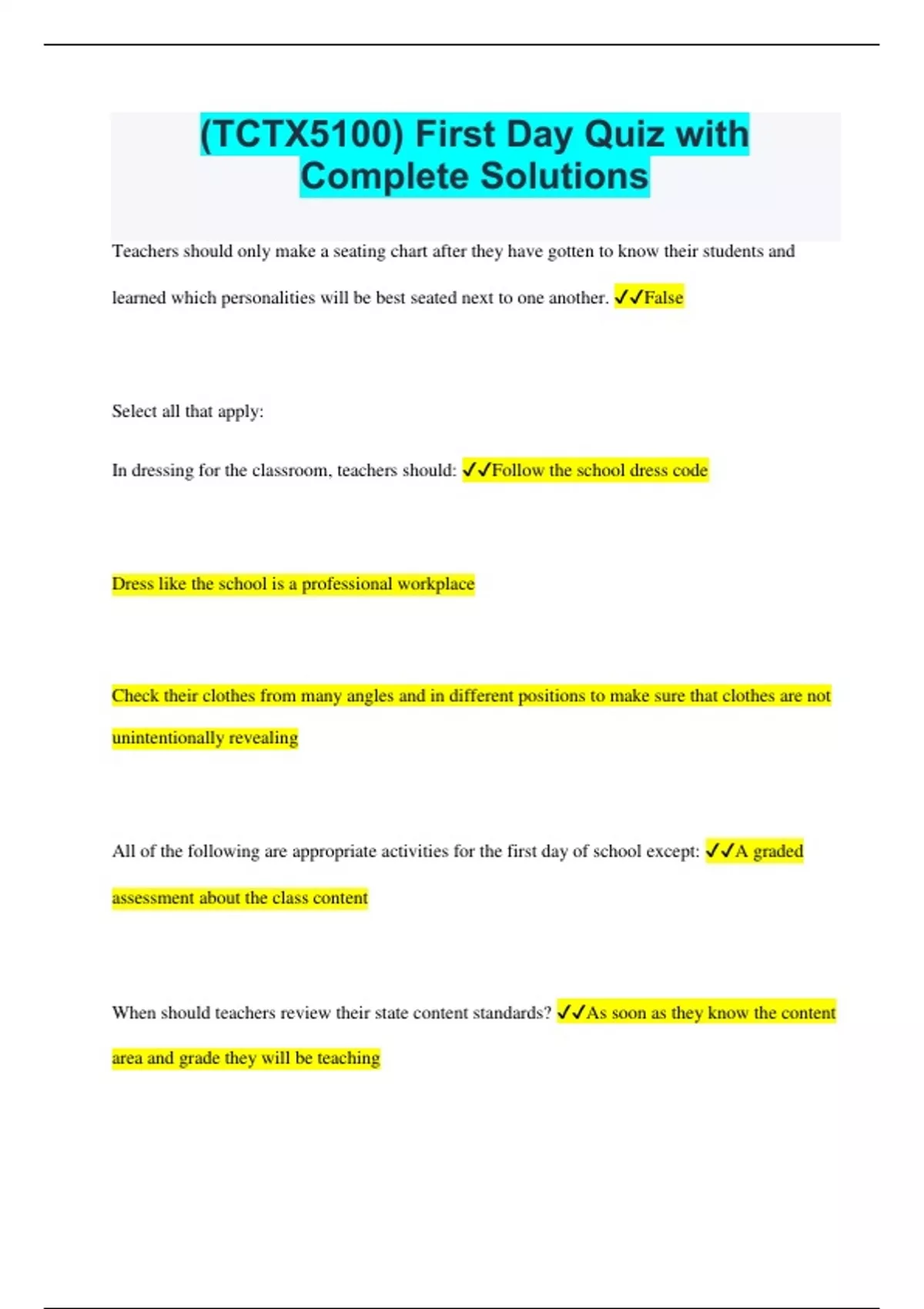 (TCTX5100) First Day Quiz with Complete Solutions Teachers should only make a seating chart after they have gotten to know their students and learned which personalities will be best seated next to one another. False Select all that apply: In dressing for the classroom, teachers should: Follow the school dress code Dress like the school is a professional workplace Check their clothes from many angles and in different positions to make sure that clothes are not unintentionally revealing All of the following are appropriate activities for the first day of school except: A graded assessment about the class content When should teachers review their state content standards? As soon as they know the content area and grade they will be teaching Teachers should begin teaching the material in their content area: After reviewing rules and procedures, but within the first or