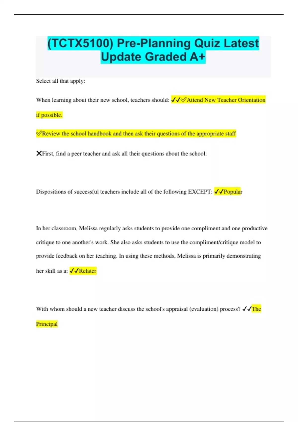 (TCTX5100) Pre-Planning Quiz Latest Update Graded A+ Select all that apply: When learning about their new school, teachers should: Attend New Teacher Orientation if possible. Review the school handbook and then ask their questions of the appropriate staff First, find a peer teacher and ask all their questions about the school. Dispositions of successful teachers include all of the following EXCEPT: Popular In her classroom, Melissa regularly asks students to provide one compliment and one productive critique to one another's work. She also asks students to use the compliment/critique model to provide feedback on her teaching. In using these methods, Melissa is primarily demonstrating her skill as a: Relater With whom should a new teacher discuss the school's appraisal (evaluation) process? The Principal New teachers can expect to feel disillusioned during