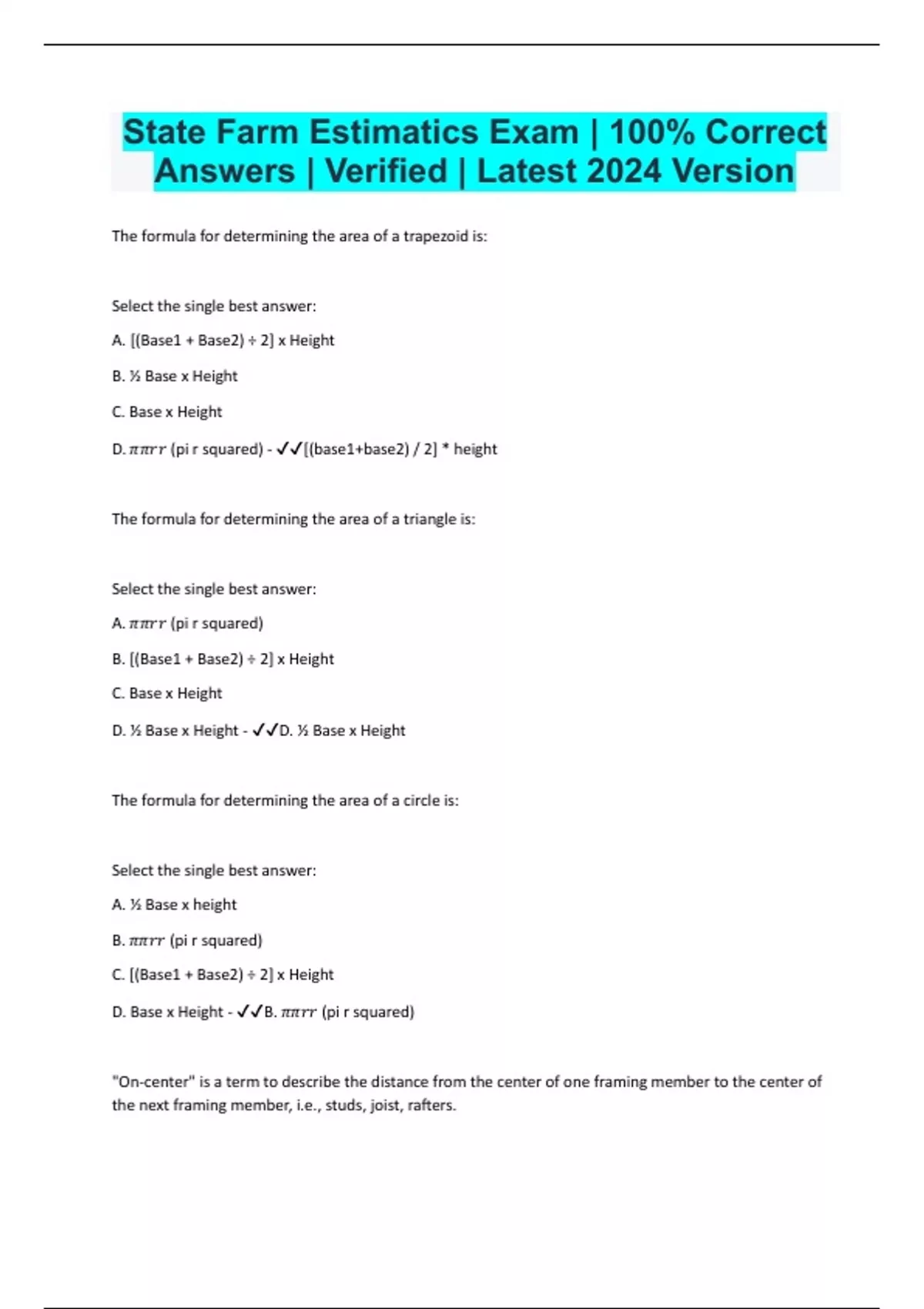 State Farm Estimatics Exam | 100% Correct Answers | Verified | Latest 2024 Version