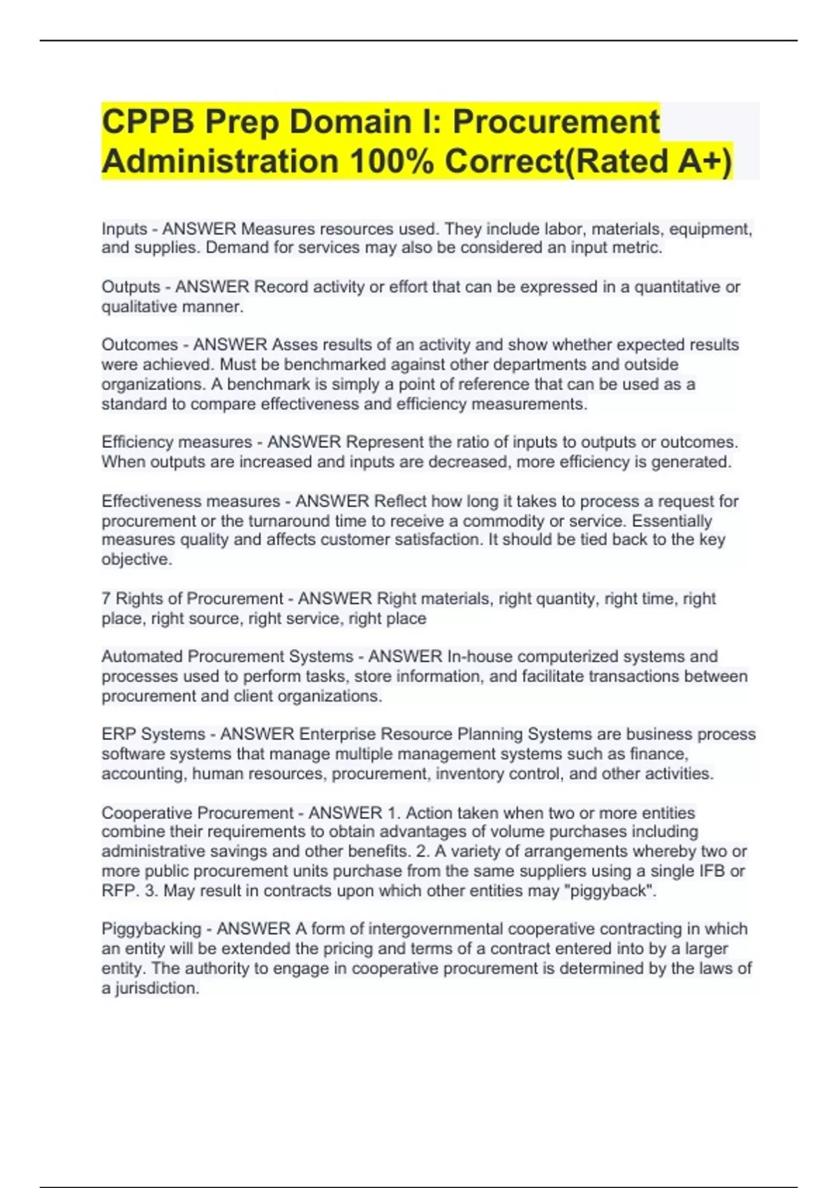 Inputs - ANSWER Measures resources used. They include labor, materials, equipment, and supplies. Demand for services may also be considered an input metric. Outputs - ANSWER Record activity or effort that can be expressed in a quantitative or qualitative manner. Outcomes - ANSWER Asses results of an activity and show whether expected results were achieved. Must be benchmarked against other departments and outside organizations. A benchmark is simply a point of reference that can be used as a standard to compare effectiveness and efficiency measurements. Efficiency measures - ANSWER Represent the ratio of inputs to outputs or outcomes. When outputs are increased and inputs are decreased, more efficiency is generated. Effectiveness measures - ANSWER Reflect how long it takes to process a request for procurement or the turnaround time to receive a commodity or service. Essentially measures quality and affects customer satisfaction. It should be tied back to the key objective. 7 Rights of Procurement - ANSWER Right materials, right quantity, right time, right place, right source, right service, right place Automated Procurement Systems - ANSWER In-house computerized systems and processes used to perform tasks, store information, and facilitate transactions between procurement and client organizations. ERP Systems - ANSWER Enterprise Resource Planning Systems are business process software systems that manage multiple management systems such as finance, accounting, human resources, procurement, inventory control, and other activities. Cooperative Procurement - ANSWER 1. Action taken when two or more entities combine their requirements to obtain advantages of volume purchases including administrative savings and other benefits. 2. A variety of arrangements whereby two or more public procurement units purchase from the same suppliers using a single IFB or RFP. 3. May result in contracts upon which other entities may "piggyback". Piggybacking - ANSWER A form of intergovernmental cooperative contracting in which an entity will be extended the pricing and terms of a contract entered into by a larger entity. The authority to engage in cooperative procurement is determined by the laws of a jurisdiction. Value Analysis - ANSWER An organized effort directed at analyzing the function of a product or s