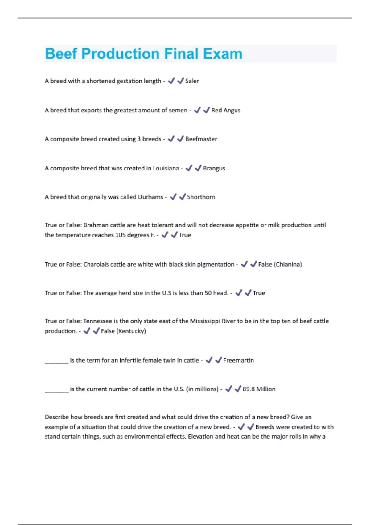 A breed with a shortened gestation length - Saler A breed that exports the greatest amount of semen - Red Angus A composite breed created using 3 breeds - Beefmaster A composite breed that was created in Louisiana - Brangus A breed that originally was called Durhams - Shorthorn True or False: Brahman cattle are heat tolerant and will not decrease appetite or milk production until the temperature reaches 105 degrees F. - True True or False: Charolais cattle are white with black skin pigmentation - False (Chianina) True or False: The average herd size in the U.S is less than 50 head. - True True or False: Tennessee is the only state east of the Mississippi River to be in the top ten of beef cattle production. - False (Kentucky) _______ is the term for an infertile female twin in cattle - Freemartin _______ is the current number of cattle in the U.S. (in millions) - 89.8 Million Describe how breeds are first created and what could drive the creation of a new breed? Give an example of a situation that could drive the creation of a new breed. - Breeds were created to with stand certain things, such as environmental effects. Elevation and heat can be the major rolls in why abreed would be created. If a cow from the Northern (cold) area where to be moved down to a Southern (hot) area, there would be a very unlikely chance that it could survive. Hence a reason to create a new breed. Give three reasons why seedstock producers are important to the beef industry. - - Semen - Genetic embryos - Bulls/replacement females What is the predominant Segment of the beef industry in Kentucky? What is the average herd size of beef operations in Kentucky? - Cow-Calf, an average herd size in Kentucky is about 27 head. Name one breed of cattle that Dr. Harrelson (she) has owned. - Limousin, Hereford, Markiana, Shorthorn, Angus What breed was first imported to Kentucky by Henry Clay? - Hereford What is the white breed cattle that originated in France? - Charolais A breed that can be red, white or roan in color. - Shorthorn Breed that was first brought to Kansas - Angus Breed also known as the Macelle breed - Maine Anjou Red breed from Scottland - Red Angus A white breed originated in Italy - Chianina Composite breed created by crossing Brahman and Shorthorn - Santa Gertrudis_____ is the average suckling time per day - 45 min _____ is the season of the year when most calves are born. - Early Spring
