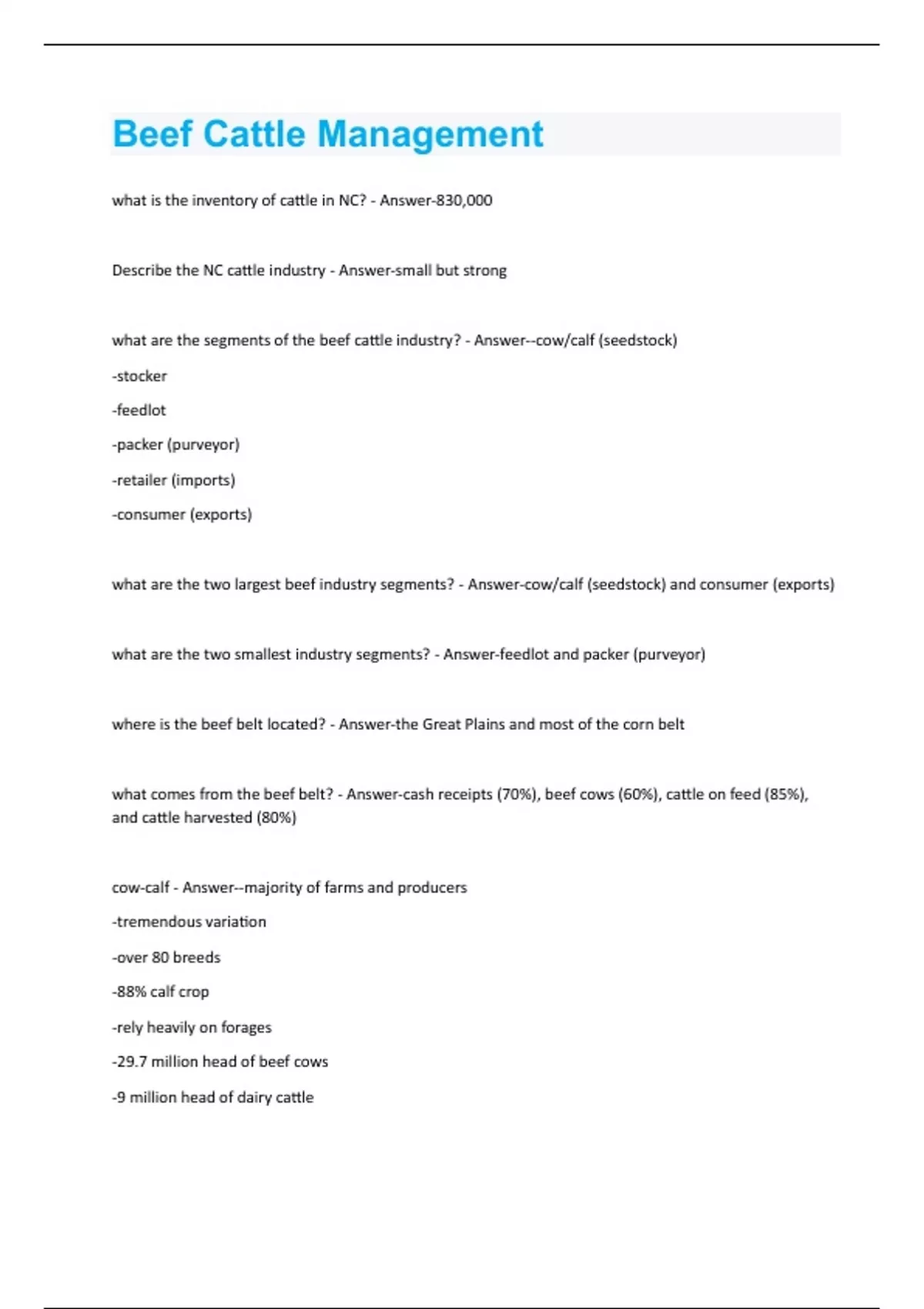 what is the inventory of cattle in NC? - Answer-830,000 Describe the NC cattle industry - Answer-small but strong what are the segments of the beef cattle industry? - Answer--cow/calf (seedstock) -stocker -feedlot -packer (purveyor) -retailer (imports) -consumer (exports) what are the two largest beef industry segments? - Answer-cow/calf (seedstock) and consumer (exports) what are the two smallest industry segments? - Answer-feedlot and packer (purveyor) where is the beef belt located? - Answer-the Great Plains and most of the corn belt what comes from the beef belt? - Answer-cash receipts (70%), beef cows (60%), cattle on feed (85%), and cattle harvested (80%) cow-calf - Answer--majority of farms and producers -tremendous variation -over 80 breeds -88% calf crop -rely heavily on forages -29.7 million head of beef cows -9 million head of dairy cattletrends in US cow herd size - Answer-increase quickly then decrease slowly around 1974 cow-calf segments - Answer-seedstock and commercial cow-calf which cows-calf segment is larger? - Answer-commercial cow-calf how many head of cattle are in the typical NC cow-calf segment? - Answer-less than 50 yearling or stocker segment - Answer--transition sector -put weight on calves before the feedlot -rely heavily on forages -some concentrate supplements feedlot segment - Answer--add weight on calves for harvest -high concentrate rations for 100 to 200 days -feed efficiency is critical - 28 million head of cattle marketed a year in what months does the amount of cattle on feedlots decrease? - Answer-july-october what are the top 12 cattle feeding states in the US? - Answer-texas,kansas, nebraska, colorado, oklahoma, idaho, california, iowa, washington, south dakota, arizona, new mexico what percentage of cattle come from the top 12 feedlot states? - Answer->98% packer segment - Answer--geographically near where cattle are fed or marketed -slaughter, process and distribute 26 billion pounds of beef annually -795 packing plants in the US (USDA inspected)-30.2 million head of cattle what are the top beef packing companies? - Answer--tyson foods -JBS beef company -cargill meat solutions -national beef -american foods group