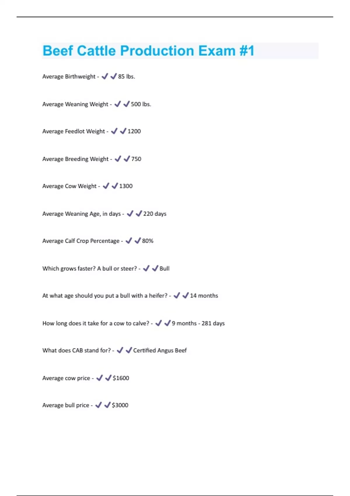 Average Birthweight - 85 lbs. Average Weaning Weight - 500 lbs. Average Feedlot Weight - 1200 Average Breeding Weight - 750 Average Cow Weight - 1300 Average Weaning Age, in days - 220 days Average Calf Crop Percentage - 80% Which grows faster? A bull or steer? - Bull At what age should you put a bull with a heifer? - 14 months How long does it take for a cow to calve? - 9 months - 281 days What does CAB stand for? - Certified Angus Beef Average cow price - $1600 Average bull price - $3000Average price for a 500 lb steer calf - $750 Average cost per acre - $2000 How many cows should be put with 1 bull? - 20-50 How many acres per cow are necessary? - At least 2, maybe 4