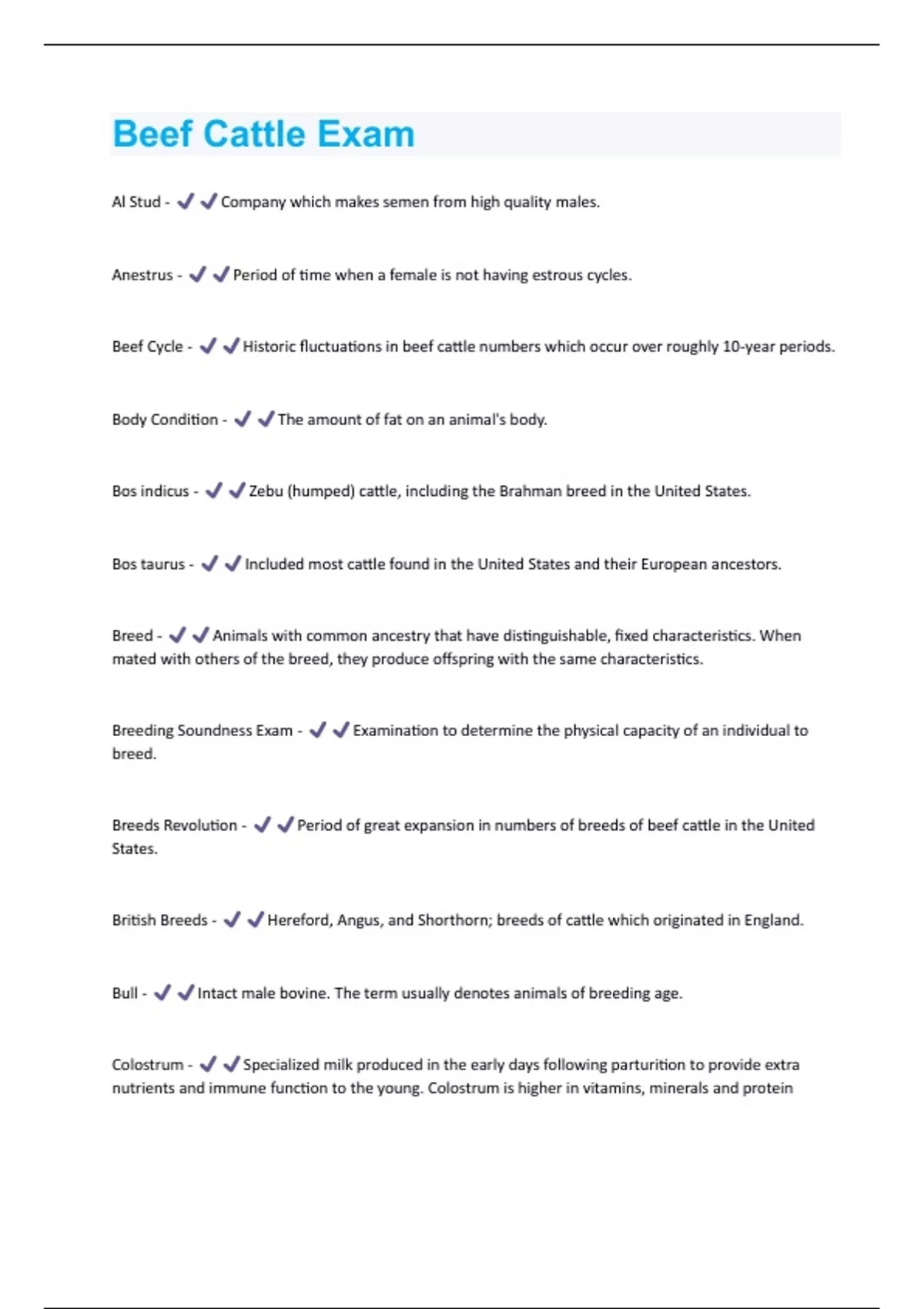 Al Stud - Company which makes semen from high quality males. Anestrus - Period of time when a female is not having estrous cycles. Beef Cycle - Historic fluctuations in beef cattle numbers which occur over roughly 10-year periods. Body Condition - The amount of fat on an animal's body. Bos indicus - Zebu (humped) cattle, including the Brahman breed in the United States. Bos taurus - Included most cattle found in the United States and their European ancestors. Breed - Animals with common ancestry that have distinguishable, fixed characteristics. When mated with others of the breed, they produce offspring with the same characteristics. Breeding Soundness Exam - Examination to determine the physical capacity of an individual to breed. Breeds Revolution - Period of great expansion in numbers of breeds of beef cattle in the United States. British Breeds - Hereford, Angus, and Shorthorn; breeds of cattle which originated in England. Bull - Intact male bovine. The term usually denotes animals of breeding age. Colostrum - Specialized milk produced in the early days following parturition to provide extra nutrients and immune function to the young. Colostrum is higher in vitamins, minerals and proteincompared with normal milk, and generally carries antibodies to aid the young in developing an immune response against potential antigens. Composite Breed - A breed developed from two or more previously established breeds. Creep - An area where young nursing animals can have access to starter feeds. Creep feeds are generally high-quality feeds made available to young animals. Cow - Sexually mature female bovine animal that ha usually produced a calf. Cow-Calf Operation - Management unit that maintains a breeding herd and produces weaned calves. Cwt - Abbreviation for hundredweight (100 pounds). Estrous Cycle - The time from one period of sexual receptivity in the female (estrus or heat) to the next. Estrus - The period when a female is receptive to mating. Synonymous with heat. Euthropication - Promotion of excess growth of one organisms to the disadvantage of other organisms in the ecosystem. Expected Progeny Difference - A prediction of the performance of an individual's progeny compared to all contemporaries for the progeny. Also known as EPD.