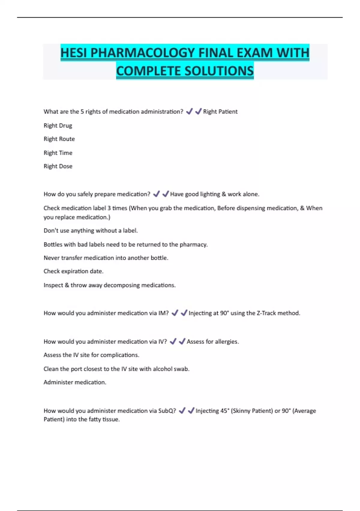 HESI PHARMACOLOGY FINAL EXAM WITH COMPLETE SOLUTIONS What are the 5 rights of medication administration? Right Patient Right Drug Right Route Right Time Right Dose How do you safely prepare medication? Have good lighting & work alone. Check medication label 3 times (When you grab the medication, Before dispensing medication, & When you replace medication.) Don't use anything without a label. Bottles with bad labels need to be returned to the pharmacy. Never transfer medication into another bottle. Check expiration date. Inspect & throw away decomposing medications. How would you administer medication via IM? Injecting at 90° using the Z-Track method. How would you administer medication via IV? Assess for allergies
