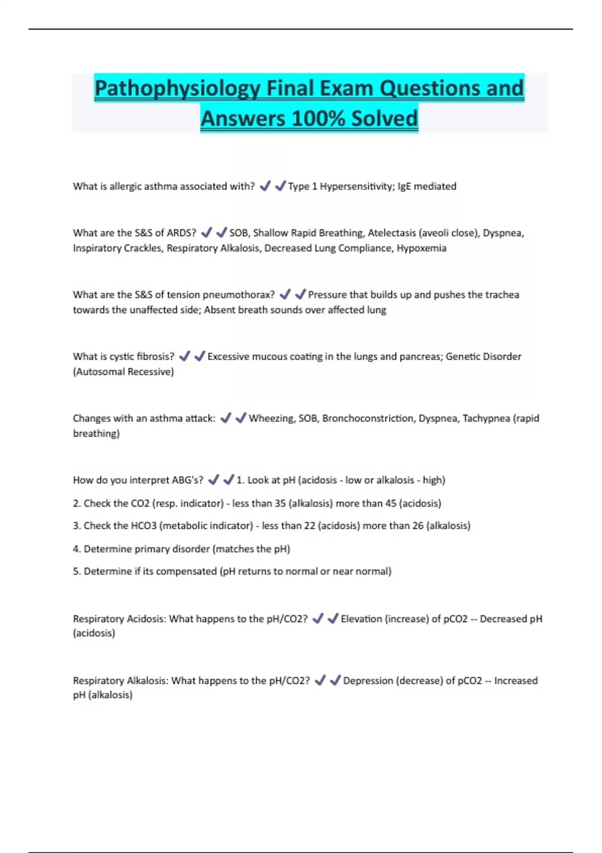 Pathophysiology Final Exam Questions and Answers 100% Solved What is allergic asthma associated with? Type 1 Hypersensitivity; IgE mediated What are the S&S of ARDS? SOB, Shallow Rapid Breathing, Atelectasis (aveoli close), Dyspnea, Inspiratory Crackles, Respiratory Alkalosis, Decreased Lung Compliance, Hypoxemia What are the S&S of tension pneumothorax? Pressure that builds up and pushes the trachea towards the unaffected side; Absent breath sounds over affected lung What is cystic fibrosis? Excessive mucous coating in the lungs and pancreas; Genetic Disorder (Autosomal Recessive) Changes with an asthma attack: Wheezing, SOB, Bronchoconstriction, Dyspnea, Tachypnea (rapid