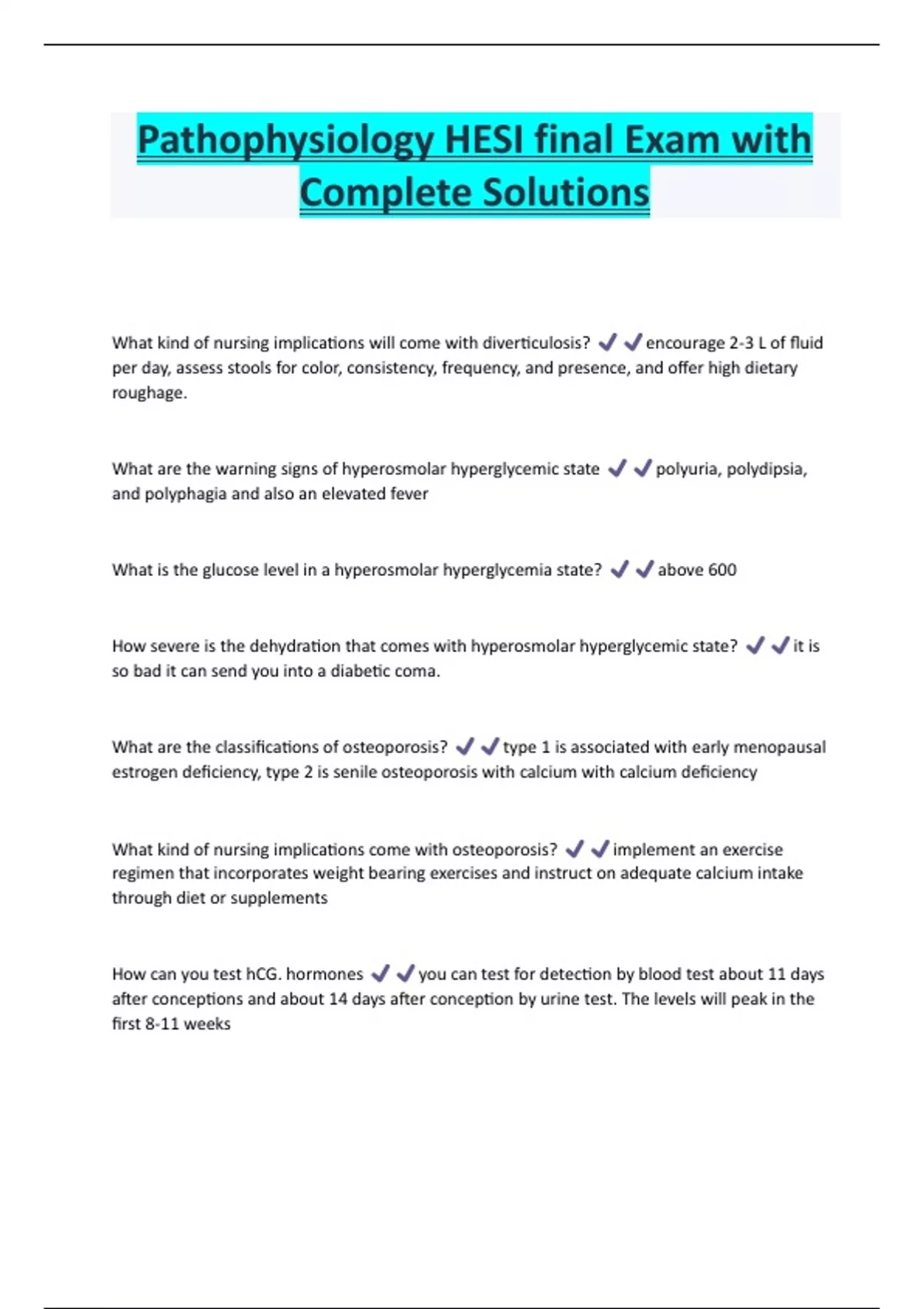 Pathophysiology HESI final Exam with Complete Solutions What kind of nursing implications will come with diverticulosis? encourage 2-3 L of fluid per day, assess stools for color, consistency, frequency, and presence, and offer high dietary roughage. What are the warning signs of hyperosmolar hyperglycemic state polyuria, polydipsia, and polyphagia and also an elevated fever What is the glucose level in a hyperosmolar hyperglycemia state? above 600 How severe is the dehydration that comes with hyperosmolar hyperglycemic state? it is so bad it can send you into a diabetic coma. What are the classifications of osteoporosis? type 1 is associated with early menopausal estrogen deficiency, type 2 is senile osteoporosis with calcium with calcium deficiency What kind of nursing implications come with osteoporosis? implement an exercise regimen that incorporates weight bearing exercises and instruct on adequate calcium intake through diet or supplements