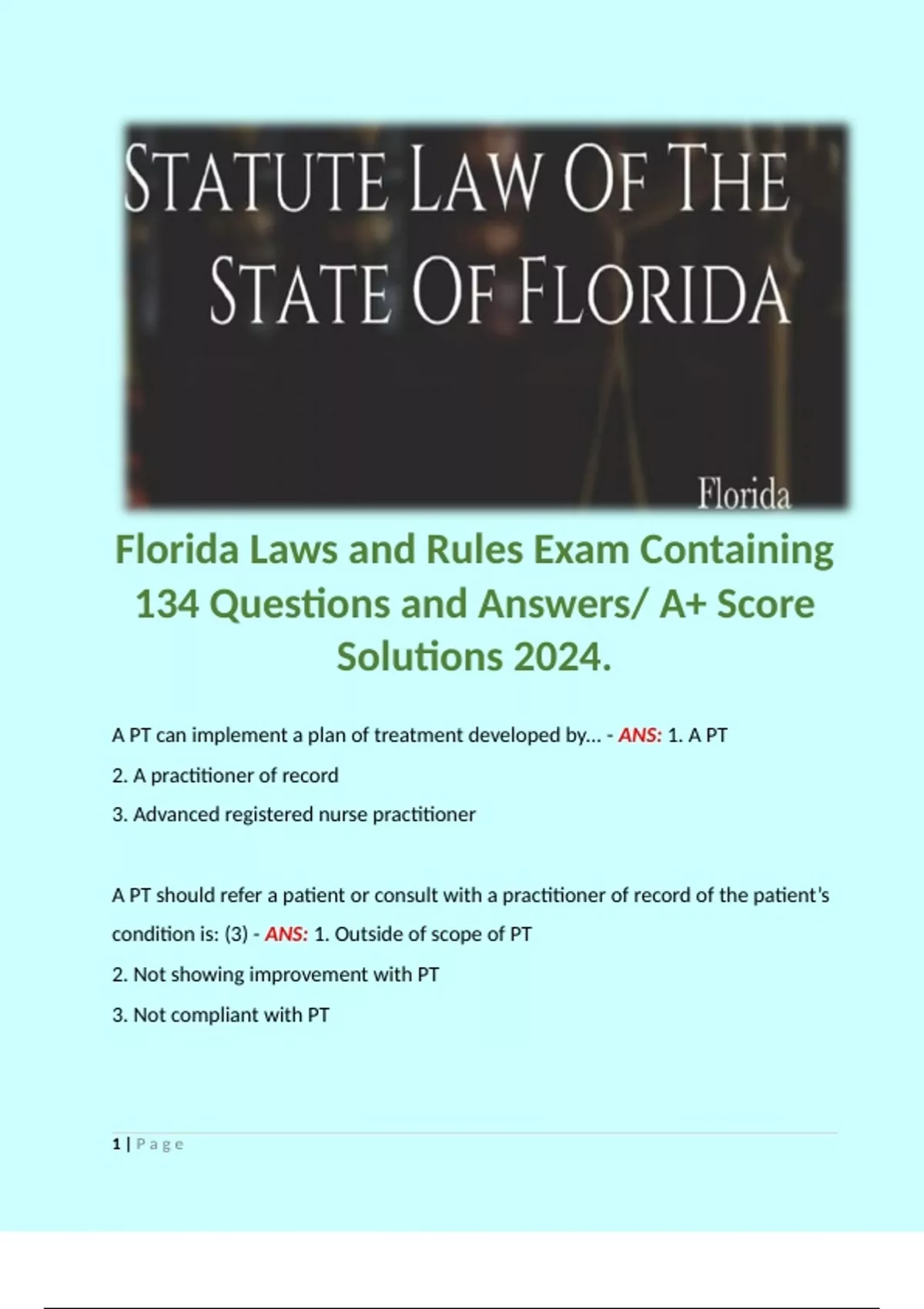 Florida Laws and Rules Exam Containing 134 Questions and Answers/ A+ Score Solutions 2024.