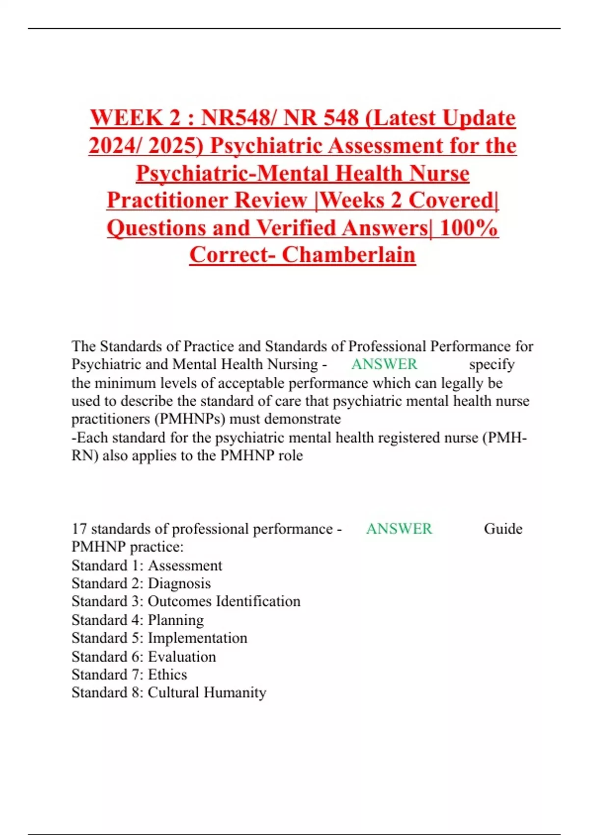 WEEK 2 : NR548/ NR 548 (Latest Update 2024/ 2025) Psychiatric Assessment for the Psychiatric-Mental Health Nurse Practitioner Review |Weeks 2 Covered| Questions and Verified Answers| 100% Correct- Chamberlain The Standards of Practice and Standards of Professional Performance for Psychiatric and Mental Health Nursing - ANSWER specify the minimum levels of acceptable performance which can legally be used to describe the standard of care that psychiatric mental health nurse practitioners (PMHNPs) must demonstrate -Each standard for the psychiatric mental health registered nurse (PMH-RN) also applies to the PMHNP role 17 standards of professional performance - ANSWER Guide PMHNP practice: Standard 1: Assessment Standard 2: Diagnosis Standard 3: Outcomes Identification Standard 4: Planning Standard 5: Implementation Standard 6: Evaluation Standard 7: Ethics Standard 8: Cultural Humanity