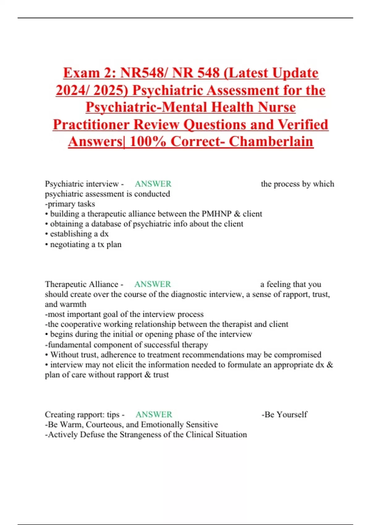 Exam 2: NR548/ NR 548 (Latest Update 2024/ 2025) Psychiatric Assessment for the Psychiatric-Mental Health Nurse Practitioner Review Questions and Verified Answers| 100% Correct- Chamberlain Psychiatric interview - ANSWER the process by which psychiatric assessment is conducted -primary tasks • building a therapeutic alliance between the PMHNP & client • obtaining a database of psychiatric info about the client • establishing a dx • negotiating a tx plan Therapeutic Alliance - ANSWER a feeling that you should create over the course of the diagnostic interview, a sense of rapport, trust, and warmth -most important goal of the interview process -the cooperative working relationship between the therapist and client • begins during the initial or opening phase of the interview -fundamental component of successful therapy • Without trust, adherence to treatment recommendations may be compromised • interview may not elicit the information needed to formulate an appropriate dx & plan of care without rapport & trust Creating rapport: tips - ANSWER -Be Yourself -Be Warm, Courteous, and Emotionally Sensitive -Actively Defuse the Strangeness of the Clinical Situation