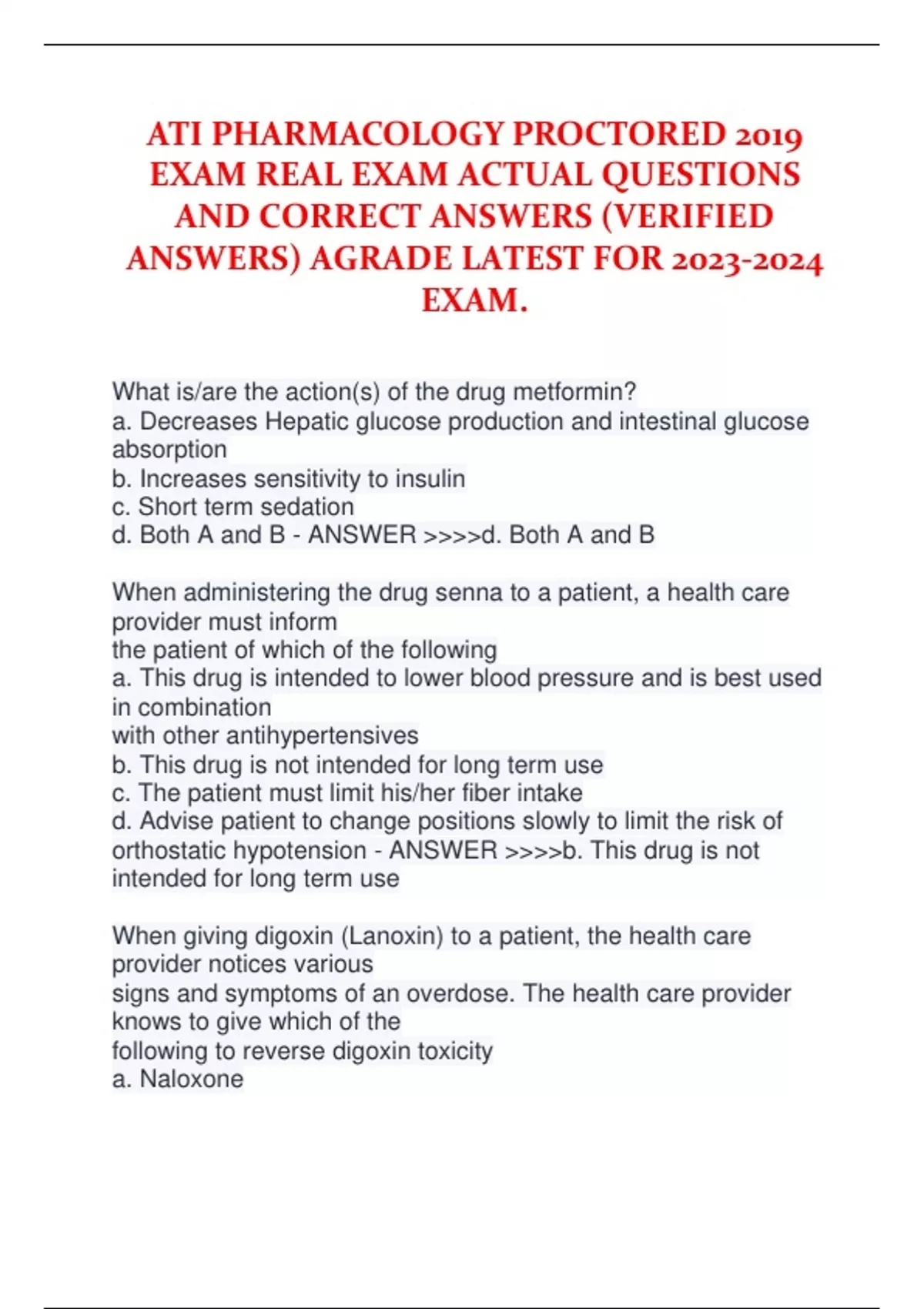 ATI PHARMACOLOGY PROCTORED 2019 EXAM REAL EXAM ACTUAL QUESTIONS AND CORRECT ANSWERS (VERIFIED ANSWERS) AGRADE LATEST FOR EXAM. What is/are the action(s) of the drug metformin? a. Decreases Hepatic glucose production and intestinal glucose absorption b. Increases sensitivity to insulin c. Short term sedation d. Both A and B - ANSWER >>>>d. Both A and B When administering the drug senna to a patient, a health care provider must inform the patient of which of the following a. This drug is intended to lower blood pressure and is best used in combination with other antihypertensives b. This drug is not intended for long term use c. The patient must limit his/her fiber intake d. Advise patient to change positions slowly to limit the risk of orthostatic hypotension - ANSWER >>>>b. This drug is not intended for long term use When giving digoxin (Lanoxin) to a patient, the health care provider notices various signs and symptoms of an overdose. The health care provider knows to give which of the following to reverse digoxin toxicity a. Naloxone b. Vitamin K c. Digibind d. Fluemanzil - ANSWER >>>>c. Digibind While providing an Angiotensin-converting enzyme (ACE) inhibitor, the patient asks what the action of the drug is. As a health care provider, you explain that the action of an ACE inhibitor is a. To lower blood pressure by blocking the conversion of angiotensin I to vasoconstrictor angiotensin II b. To inhibit reabsorption of sodium back into the body, ultimately increasing urine output and lowering blood pressure c. To decrease heart rate and blood pressure by competing with Beta1 and Beta2 rec - ANSWER >>>>a. To lower blood pressure by blocking the conversion of angiotensin I to vasoconstrictor angiotensin II Which of the following types of insulin is "long-acting"? a. Lispro (Humalog) b. NPH (Humulin N) c. Regular insulin (Humulin R) d. Glargine (Lantus) - ANSWER >>>>d. Glargine (Lantus) 1. What is the therapeutic use of metformin? A. Lower blood pressure. B. To diminish seizure activity. C. The maintenance of a person's blood glucose. D. Increase heart rate and decrease gastrointestinal secretions. - ANSWER >>>>C. The maintenance of a person's blood glucose. 1. What is the correct definition for absorption of a drug?