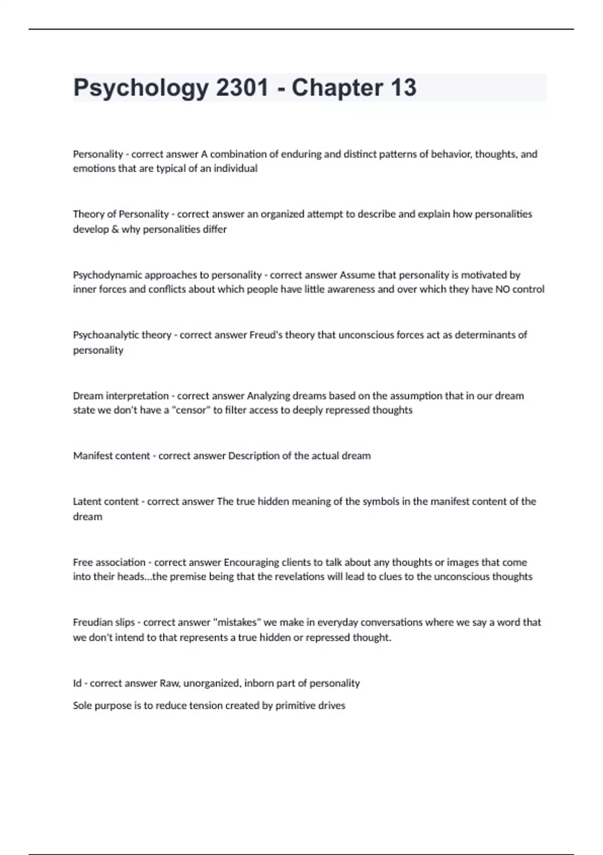 Psychology 2301 - Chapter 13 with correct answers rtaed A+Personality - correct answer A combination of enduring and distinct patterns of behavior, thoughts, and emotions that are typical of an individual Theory of Personality - correct answer an organized attempt to describe and explain how personalities develop & why personalities differ Psychodynamic approaches to personality - correct answer Assume that personality is motivated by inner forces and conflicts about which people have little awareness and over which they have NO control Psychoanalytic theory - correct answer Freud's theory that unconscious forces act as determinants of personality Dream interpretation - correct answer Analyzing dreams based on the assumption that in our dream state we don't have a "censor" to filter access to deeply repressed thoughts Manifest content - correct answer Description of the actual dream Latent content - correct answer The true hidden meaning of the symbols in the manifest content of the dream Free association - correct answer Encouraging clients to talk about any thoughts or images that come into their heads...the premise being that the revelations will lead to clues to the unconscious thoughts Freudian slips - correct answer "mistakes" we make in everyday conversations where we say a word that we don't intend to that represents a true hidden or repressed thought. Id - correct answer Raw, unorganized, inborn part of personality Sole purpose is to reduce tension created by primitive drives