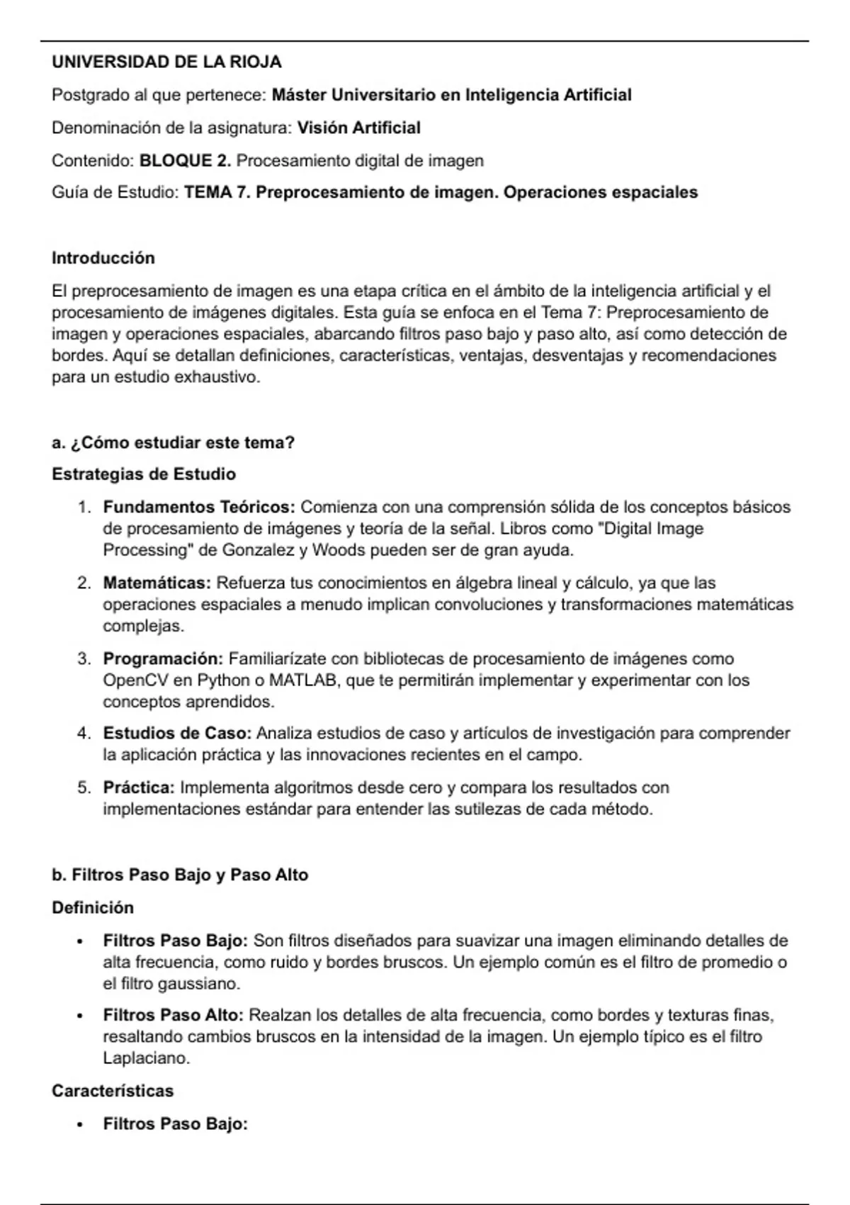 imagen y operaciones espaciales, abarcando filtros paso bajo y paso alto, así como detección de