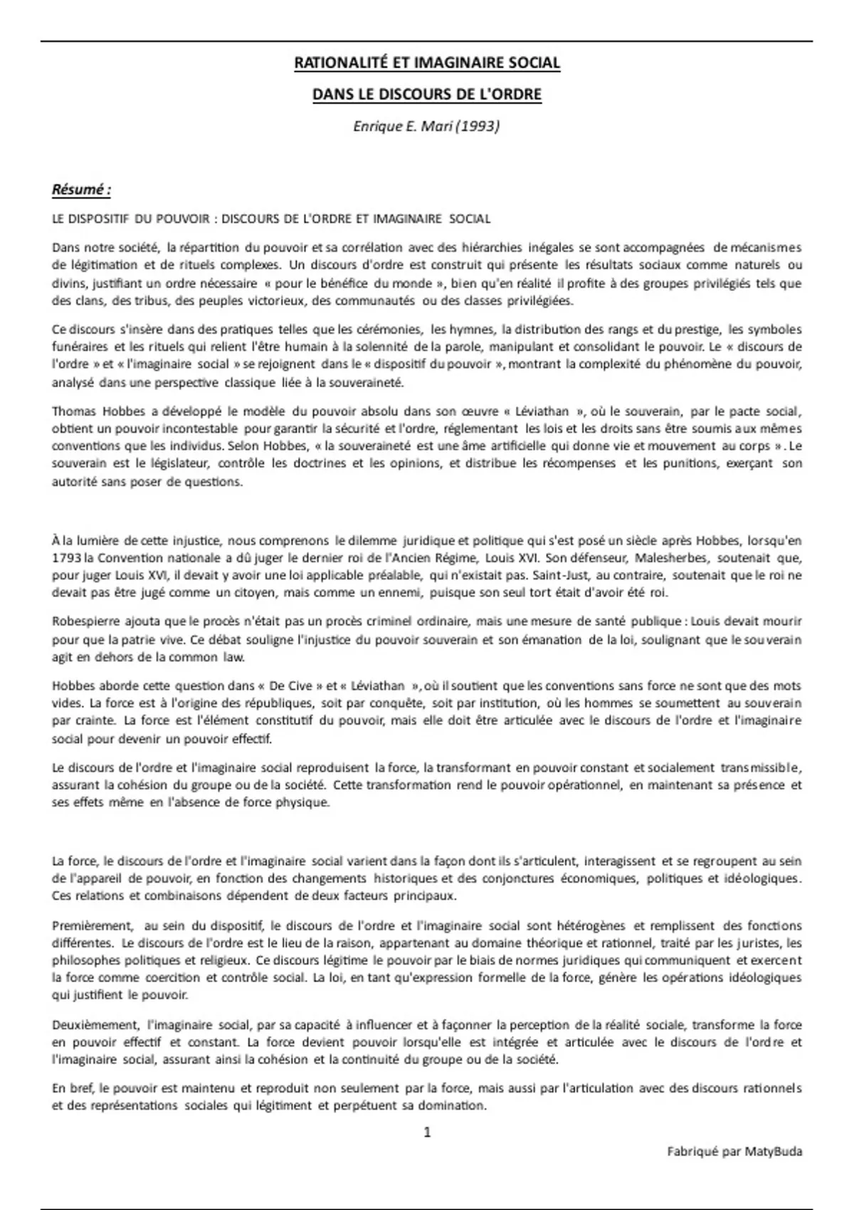 Le discours de l'ordre et l'imaginaire social reproduisent la force, la transformant en pouvoir constant et socialement transmissible,
