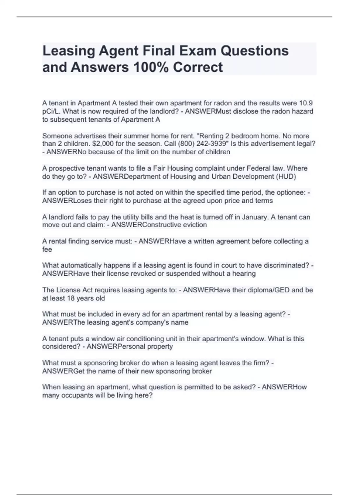 Leasing Agent Final Exam Questions and Answers 100% CorrectLeasing Agent Final Exam Questions and Answers 100% CorrectLeasing Agent Final Exam Questions and Answers 100% CorrectLeasing Agent Final Exam Questions and Answers 100% CorrectLeasing Agent Final Exam Questions and Answers 100% CorrectA tenant in Apartment A tested their own apartment for radon and the results were 10.9 pCi/L. What is now required of the landlord? - ANSWERMust disclose the radon hazard to subsequent tenants of Apartment A Someone advertises their summer home for rent. "Renting 2 bedroom home. No more than 2 children. $2,000 for the season. Call (800) 242-3939" Is this advertisement legal? - ANSWERNo because of the limit on the number of children A prospective tenant wants to file a Fair Housing complaint under Federal law. Where