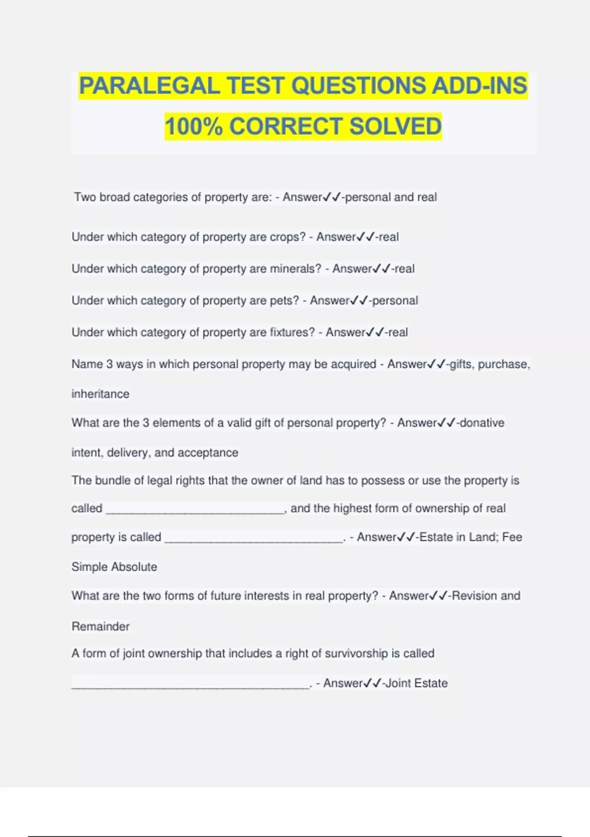 PARALEGAL TEST QUESTIONS ADD-INS 100% CORRECT SOLVED Two broad categories of property are: - Answer️️ -personal and real Under which category of property are crops? - Answer️️ -real Under which category of property are minerals? - Answer️️ -real Under which category of property are pets? - Answer️️ -personal Under which category of property are fixtures? - Answer️️ -real Name 3 ways in which personal property may be acquired - Answer️️ -gifts, purchase, inheritance What are the 3 elements of a valid gift of personal property? - Answer️️ -donative intent, delivery, and acceptance The bundle of legal rights that the owner of land has to possess or use the property is called ___________________________, and the highest form of ownership of real property is called ___________________________. - Answer️️ -Estate in Land; Fee Simple Absolute What are the two forms of future interests in real property? - Answer️️ -Revision and Remainder A form of joint ownership that includes a right of survivorship is called ____________________________________. - Answer️️ -Joint Estate How many states recognize community property of a married couple? - Answer️️ -9 In real property transfer, the seller is called the _____________ and the buyer is called the _____________________. - Answer️️ -grantor; grantee The ethical rules for attorneys and paralegals in Texas are called: - Answer️️ -Texas Disciplinary Rules of Professional Conduct UPL stands for: - Answer️️ -unauthorized practice of law May a paralegal sign a pleading by permission? - Answer️️ -No May a paralegal sign a certificate of service? - Answer️️ -No What should be in the signature box of the paralegal? - Answer️️ -name and title Is an attorney signature stamp the same as signing by permission? - Answer️️ -Yes Is it alright for an attorney to give a paralegal a bonus based on the settlement of a big case? - Answer️️ -Yes Is UPL a civil offense, a criminal offense, neither, or both? - Answer️️ -Both From what two restaurants did the plaintiff and defendant order meals on Sept. 20? - Answer️️ -The Pass and Provisions What are the names of the defendant's two sons: - Answer️️ -Colin and Sean What are the names of the defendant's sister-in-law's daughters? - Answer️️ -Kelsey, Megan, Brigid Where did the plaintiff work before being hired at this firm? - Answer️️ -Lone Star Legal