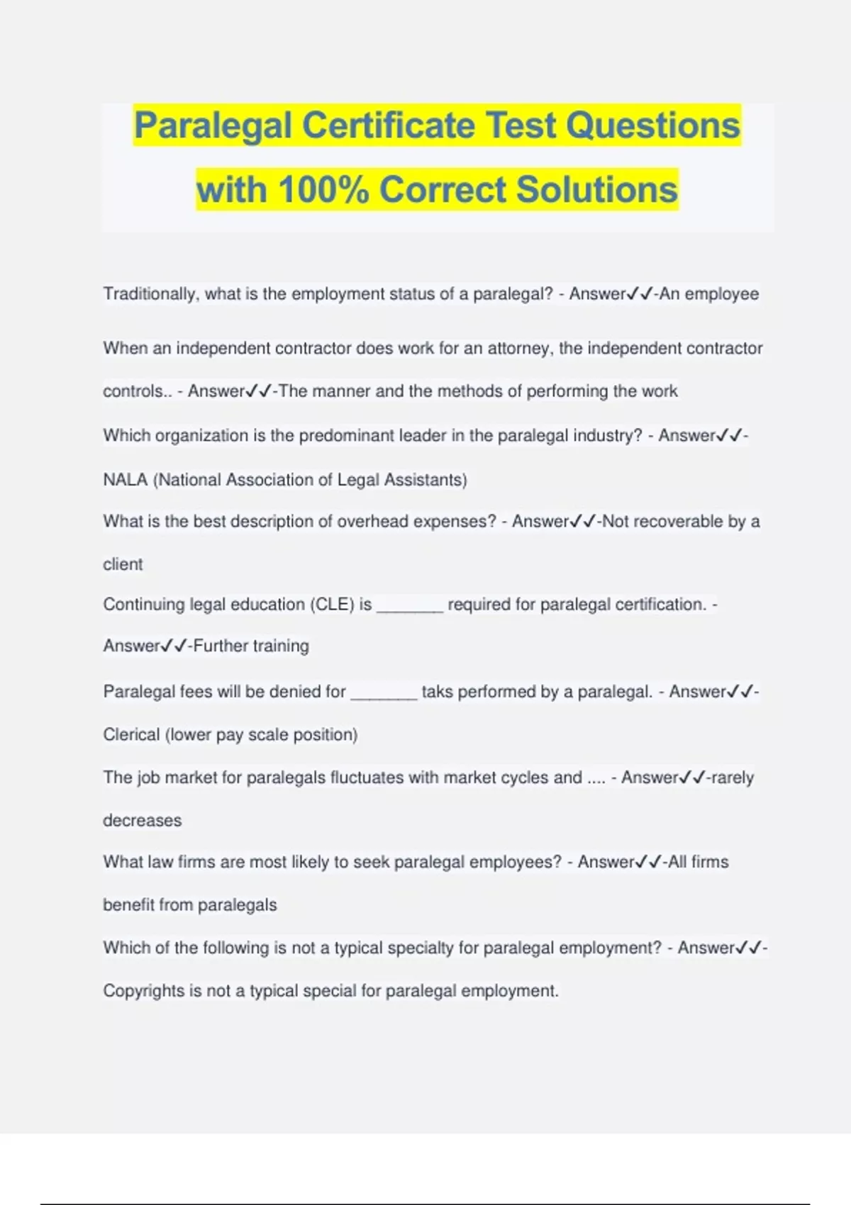 Paralegal Certificate Test Questions with 100% Correct Solutions Traditionally, what is the employment status of a paralegal? - Answer️️ -An employee When an independent contractor does work for an attorney, the independent contractor controls.. - Answer️️ -The manner and the methods of performing the work Which organization is the predominant leader in the paralegal industry? - Answer️️ - NALA (National Association of Legal Assistants) What is the best description of overhead expenses? - Answer️️ -Not recoverable by a client Continuing legal education (CLE) is _______ required for paralegal certification. - Answer️️ -Further training Paralegal fees will be den