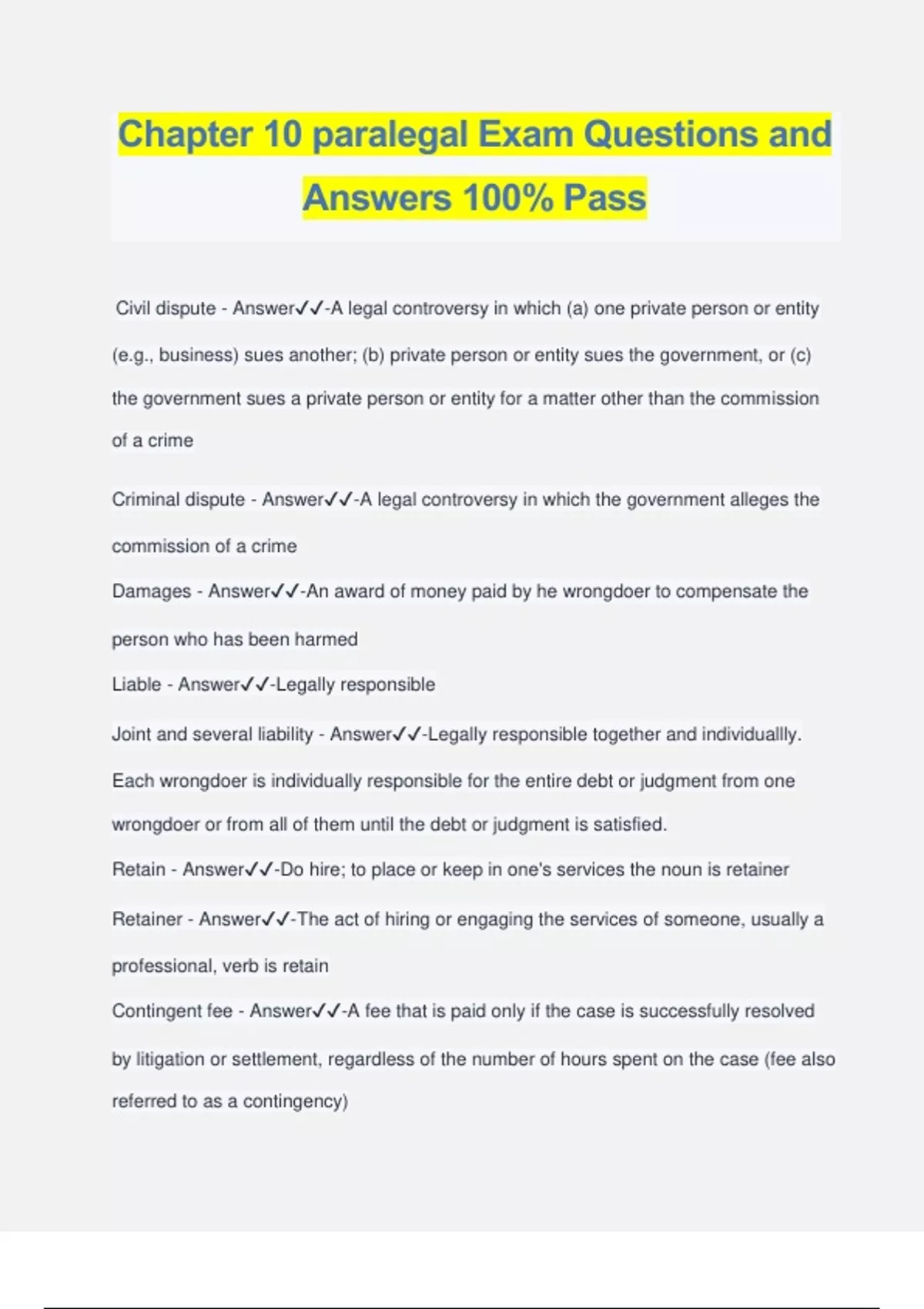 Chapter 10 paralegal Exam Questions and Answers 100% Pass Civil dispute - Answer️️ -A legal controversy in which (a) one private person or entity (e.g., business) sues another; (b) private person or entity sues the government, or (c) the government sues a private person or entity for a matter other than the commission of a crime Criminal dispute - Answer️️ -A legal controversy in which the government alleges the commission of a crime Damages - Answer️️ -An award of money paid by he wrongdoer to compensate the person who has been harmed Liable - Answer️️ -Legally responsible Joint and several liability - Answer️️ -Legally responsible together and individuallly. Each wrongdoer is individually responsible for the entire debt or judgment from one wrongdoer or from all of them until the debt or judgment is satisfied. Retain - Answer️️ -Do hire; to place or keep in one's services the noun is retainer Retainer - Answer️️ -The act of hiring or engaging the services of someone, usually a professional, verb is retain Contingent fee - Answer️️ -A fee that is paid only if the case is successfully resolved by litigation or settlement, regardless of the number of hours spent on the case (fee also referred to as a contingency) Appearance - Answer️️ -Formally coming before a tribunal as a party or as a representative of party. The attorney usually appears by filing a notice of appearance in court Praecipe - Answer️️ -Praecipe is a formal request to the court (usually directed to the court clerk) that something be done Attorney of record - Answer️️ -The attorney noted in the court files as the attorney representing a particular party. Once litigation has begun, attorneys of record may need court permission to withdraw from the case before it is concluded. Forum - Answer️️ -(1) a court. (2) the place where the parties are presently litigating their dispute (3) a court or other tribunal hearing a case. Estate - Answer️️ -All of the assets and liabilities of a decedent (one who has died) at the time of his or her death. When we say that an estate is sued (or brings a suit) we are referring to the decedent's representative who is authorized to resolve claims involving the decedent's assets and debts Subject-matter jurisdiction - Answer️️ -The court's power to resolve a particular type of legal dispute and to grant a particular type of relief. Diversity of citizenship - Answer️️ -The disputing parties are citizens of different states and the amount in controversy exceeds $75,000. This diversity gives subject-matter jurisdiction to a U.S> district court. U.S> district court - Answer️️ -The main trial court in the federal judicial system with subject-matter jurisdiction over civil and criminal cases Venue - Answer️️ -The proper county or geographical area in which a court with jurisdiction may hear a case. In most judicial systems there is more than one trial court. Complaint - Answer️️ -(1) a plaintiff's first pleading, stating a cause of action against the defendant. Aka petition (2) a formal criminal charge Plaintiff - Answer️️ -The person who initiates a civil (and sometimes a criminal) action in court Cause of action - Answer️️ -(1) a legally acceptable reason for suing. A rule that constitutes a legal theory for bringing a suit. (2) the facts that give a person a right to judicial relief. Negligence - Answer️️ -The failure to use reasonable care that an ordinary prudent person would have used in a similar situation , resulting in injury or other loss. Stating a cause of action - Answer️️ -Including facts in a pleading (e.g.,a complaint) that, if proved at trial, would entitle the party to the judicial relief sought (assuming the other party does not plead and prove a defense that would defeat the effort) Codefendant - Answer️️ -Two or more defendants who are sued in the same civil case or who are prosecuted in the same criminal case. Pleading - Answer️️ -A formal litigation document filed by a party that states or responds to the claims and defenses the parties have against each other. The major pleadings are the complaint and answer Allegation - Answer️️ -A claimed fact. A fact that a party will try to prove at trial Information and belief - Answer️️ -Good-faith belief as to the truth of an allegation, not based on firsthand knowledge. A standard legal term used to indicate that the allegation is not based on the firsthand knowledge of the person making the allegation, but that the person, nevertheless believes in good faith that the allegation is true. Prayer for relief: - Answer️️ -The request in a pleading for damages or o