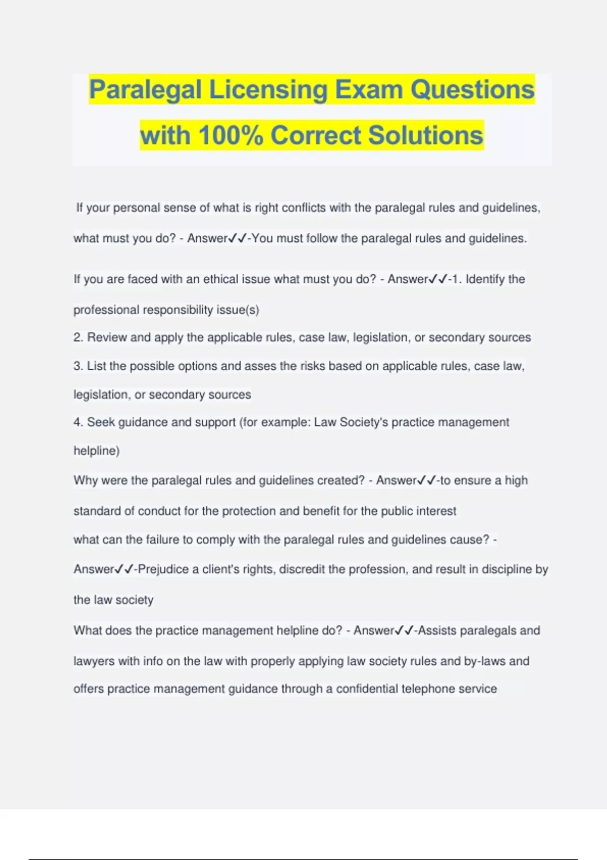 Paralegal Licensing Exam Questions with 100% Correct Solutions If your personal sense of what is right conflicts with the paralegal rules and guidelines, what must you do? - Answer️️ -You must follow the paralegal rules and guidelines. If you are faced with an ethical issue what must you do? - Answer️️ -1. Identify the professional responsibility issue(s) 2. Review and apply the applicable rules, case law, legislation, or secondary sources 3. List the possible options and asses the risks based on applicable rules, case law, legislation, or secondary sources 4. Seek guidance and support (for example: Law Society's practice management helpline) Why were the paralegal rules and guidelines created? - Answer️️ -to ensure a high standard of conduct for the protection and benefit for the public interest what can the failure to comply with the paralegal rules and guidelines cause? - Answer️️ -Prejudice a client's rights, discredit the profession, and result in discipline by the law society What does the practice management helpline do? - Answer️️ -Assists paralegals and lawyers with info on the law with properly applying law society rules and by-laws and offers practice management guidance through a confidential telephone service What does the Coach and Advisor network do? - Answer️️ -Provides paralegals and lawyers with access to shorter-term, outcome-oriented relationships with coaches and advisors who are drawn from the legal professions. Coaches support the implementation of best practices, and advisors assists with substantive and procedural law inquiries on client files. How is the competence of lawyers and paralegals monitored? - Answer️️ -Law society administers spot audits, practice management reviews, and practice audit programs, all are remedial in nature. What do practice audits asses? - Answer️️ -A paralegals practice management processes, as well as their compliance with the financial record-keeping requirements outlined in by-law 9. What's the process of a complaint about a paralegal or lawyer? - Answer️️ -You must send the law society in writing the complaint which is first reviewed by the CSC's complaints and compliance department to make sure the issue is within jurisdiction. If the issue can be resolved informally, then the intake and resolution department will handle the complaint. If it is a serious allegation on professional misconduct, incapacity, or incompetence, then it is likely to result in discipline against the paralegal or lawyer, and the paralegal/lawyer will be referred to the investigation services for an investigation. What are the investigation services options? - Answer️️ -they can close the matter, with or without remedial action, or make a recommendation to the proceedings authorization committee (PAC) that the matter be remediated or sent for a hearing. What are the different ways in which a hearing may discipline paralegals/lawyers? - Answer️️ -Revoking their license, participate in CPD or professional training, cooperate in a practice review, restrict their practice to certain areas, provide legal services, not maintain a trust account, pay a fine, refund to a client all or a portion of fees, and/or start or continue treatment or counselling Can a paralegal/lawyer appeal an decision of the hearing panel? - Answer️️ -Yes, they can appeal to an appeal panel, or appeal the decision of an appeal panel to a Divisional Court. T or F: If the Law Society receives a complaint against a paralegal, the paralegal will be notified and given an opportunity to respond? - Answer️️ -True T or F: Failure to respond promptly and completely to any communication from the Law Society is NOT a breach of the paralegal rules and is grounds for discipline. - Answer️️ -False, It is a breach! T or F: A paralegal/lawyer can be suspended for administrative reasons immediately if they do not pay annual fees to the law society. - Answer️️ -True T or F: Administrative suspensions are automatically lifted as soon as the suspended licensees meet their administrative obligations to the Law Society? - Answer️️ -True T or F: Licensee that have been administratively suspended for a period of more than 12 months may have their license revoked. - Answer️️ -True Which bylaw outlines the paralegal scope of practice? - Answer️️ -Bylaw 4 Can a paralegal continue to represent a client if the court changes the charge to an indictable offence? - Answer️️ -No T or F: A paralegal must withdraw either from representation of the client or from the outside interest when a conflict of interest arises. - Answer️️ -True What legislation gives every person a right to equal treatment without discrimination? - Answer️️ -Ontario Human Rights Code T or F: Paralegals must ensure their practice follows the Ontario Human Right Code and the Occupational Health and Safety Act (OHSA) - Answer️️ -True T or F: It is mandatory for paralegals that employ 6 employees or more are required to have written policies posted in a conspicuous place in the workplace. - Answer️️ -True What is cultural competence? - Answer️️ -the ability to interact effectively with people of different cultures T or F: The engagement does not begin until the retainer agreement or engagement letter is signed by the client and applicable money has been paid. - Answer️️ -True T or F: If a paralegal was retained only to provide limited services to the client, the paralegal must provide the client with a termination letter. - Answer️️ -True T or F: It is acceptable for paralegals to engage in sharp practice. - Answer️️ -False T or F: If a paralegal does not cooperate with a person conducting an investigation, it can result in a discipline proceeding before the LSO. - Answer️️ -True T or F: If a paralegal is a mediator, then communications are covere