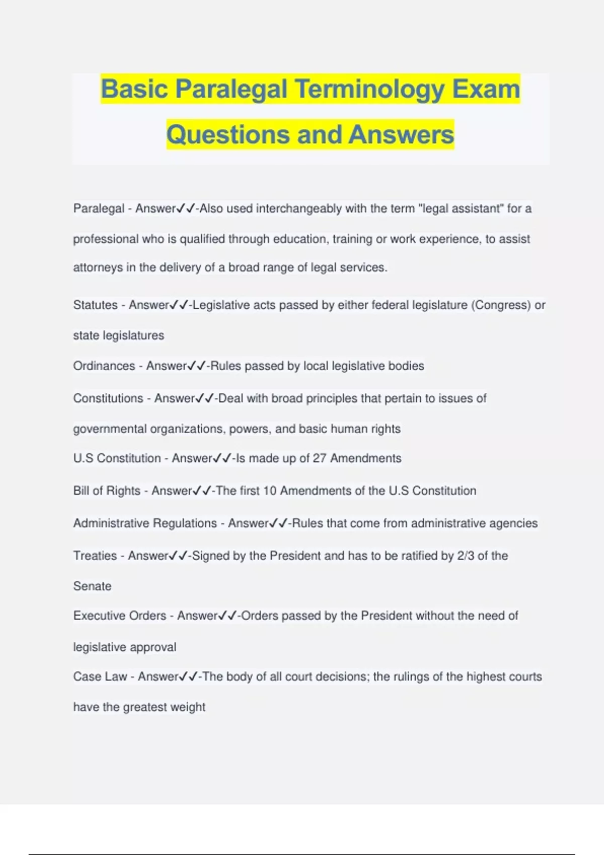 Basic Paralegal Terminology Exam Questions and Answers Paralegal - Answer️️ -Also used interchangeably with the term "legal assistant" for a professional who is qualified through education, training or work experience, to assist attorneys in the delivery of a broad range of legal services. Statutes - Answer️️ -Legislative acts passed by either federal legislature (Congress) or state legislatures Ordinances - Answer️️ -Rules passed by local legislative bodies Constitutions - Answer️️ -Deal with broad principles that pertain to issues of governmental organizations, powers, and basic human rights U.S Constitution - Answer️️ -Is made up of 27 Amendments Bill of Rights - Answer️️ -The first 10 Amendments of the U.S Constitution Administrative Regulations - Answer️️ -Rules that come from administrative agencies Treaties - Answer️️ -Signed by the President and has to be ratified by 2/3 of the Senate Executive Orders - Answer️️ -Orders passed by the President without the need of legislative approval Case Law - Answer️️ -The body of all court decisions; the rulings of the highest courts have the greatest weight Precedent - Answer️️ -A legal decision that will serve as an authoritative rule or pattern in the future for similar cases. Mandatory Precedent - Answer️️ -When the ruling of a higher court must be followed by the present court. Persuasive Precedent - Answer️️ -Precedent that is not mandatory but is useful or relevant in making the decision in a current case Stare Decisis - Answer️️ -The tendency to follow precedent Civil Suits - Answer️️ -The adjudication of private rights b