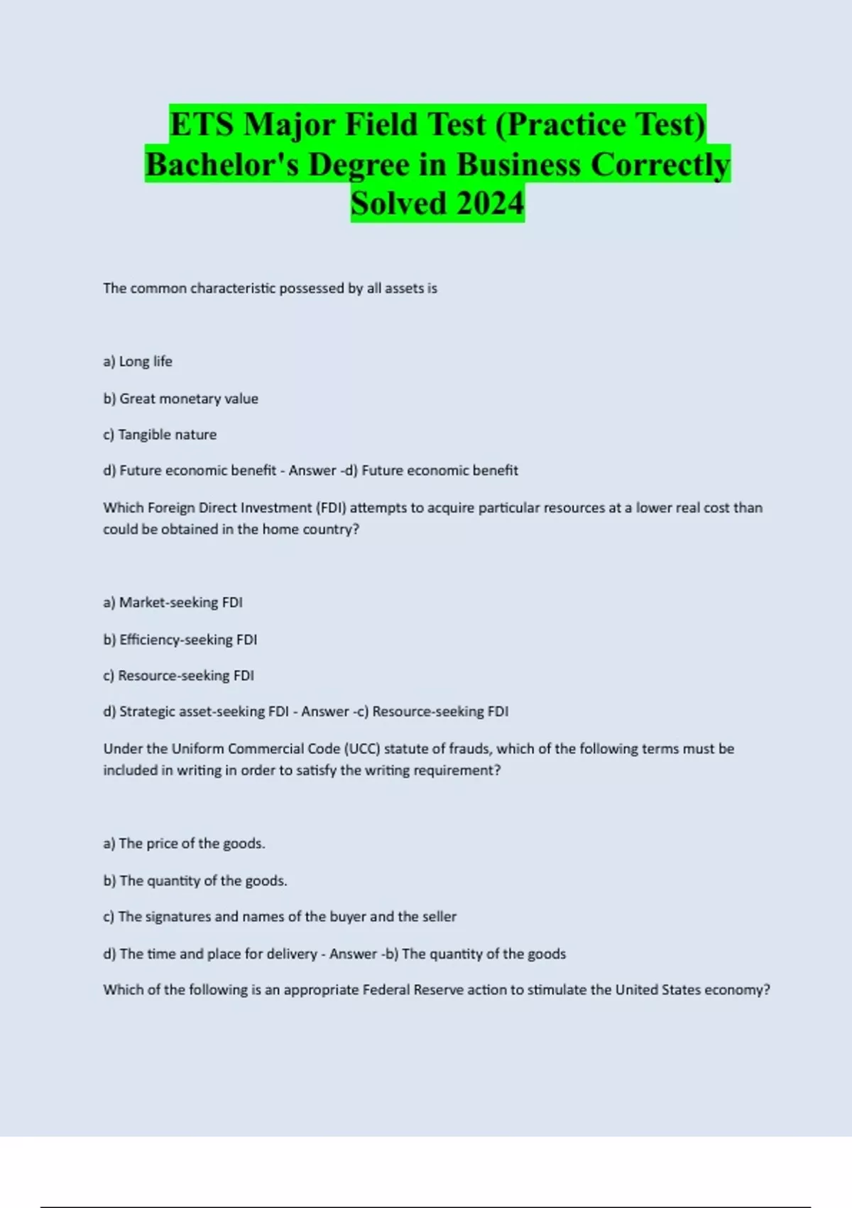 ETS Major Field Test (Practice Test) Bachelor's Degree in Business Correctly Solved 2024 The common characteristic possessed by all assets is a) Long life b) Great monetary value c) Tangible nature d) Future economic benefit - Answer -d) Future economic benefit Which Foreign Direct Investment (FDI) attempts to acquire particular resources at a lower real cost than could be obtained in the home country? a) Market-seeking FDI b) Efficiency-seeking FDI c) Resource-seeking FDI d) Strategic asset-seeking FDI - Answer -c) Resource-seeking FDI Under the Uniform Commercial Code (UCC) statute of frauds, which of the following terms must be included in writing in order to satisfy the writing requirement? a) The price of the goods. b) The quantity of the goods. c) The signatures and names of the buyer and the seller d) The time and place for delivery - Answer -b) The quantity of the goods Which of the following is an appropriate Federal Reserve action to stimulate the United States economy?a) Selling government bonds on the open market b) Increasing the discount rate c) Reducing the reserve requirement d) Cutting taxes - Answer -c) Reducing the reserve requirement Which of the following is true with regard to an exculpatory clause? a) An exculpatory clause excuses one party from liability for his/her own tortious conduct. b) Where one party has a superior bargaining position that has enabled him/her to impose an exculpatory clause upon the other, the courts are incline