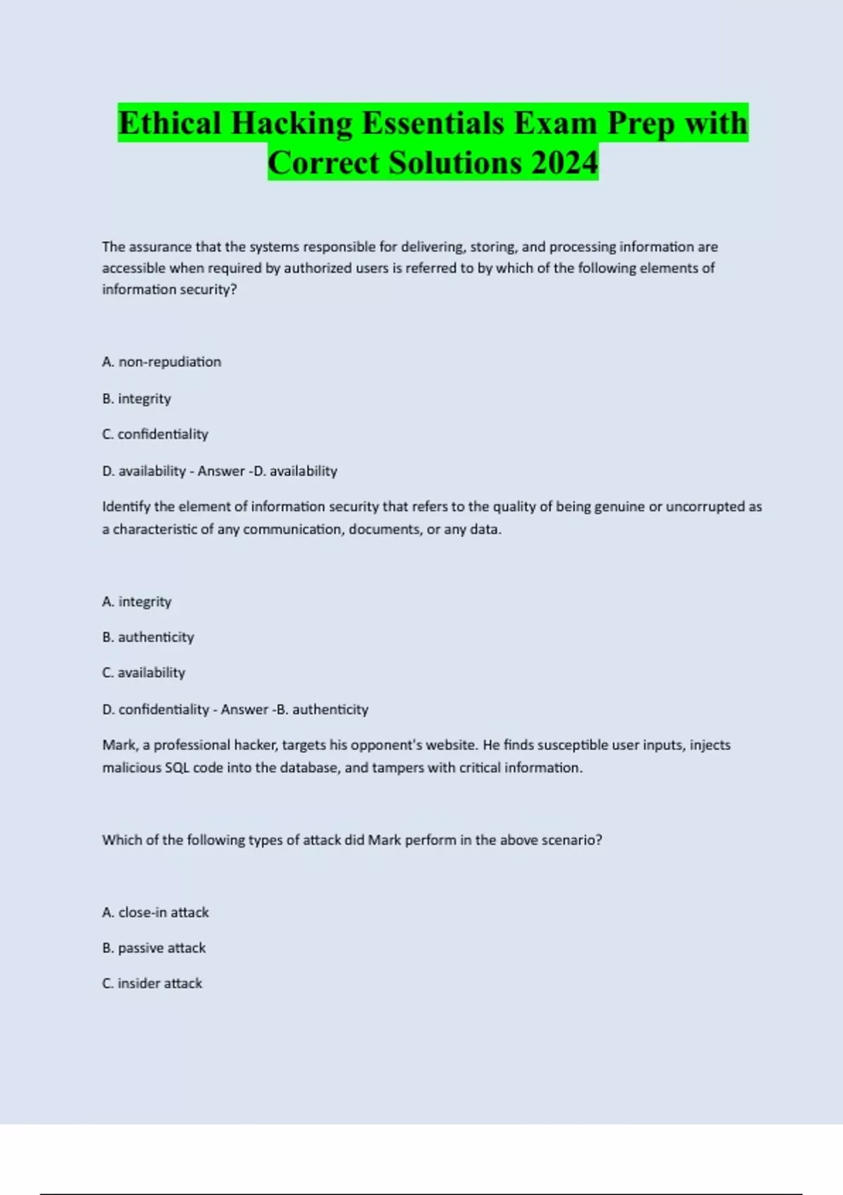 Ethical Hacking Essentials Exam Prep with Correct Solutions 2024 The assurance that the systems responsible for delivering, storing, and processing information are accessible when required by authorized users is referred to by which of the following elements of information security? A. non-repudiation B. integrity C. confidentiality D. availability - Answer -D. availability Identify the element of information security that refers to the quality of being genuine or uncorrupted as a characteristic of any communication, documents, or any data. A. integrity B. authenticity C. availability D. confidentiality - Answer -B. authenticity Mark, a professional hacker, targets his opponent's website. He finds susceptible user inputs, injects malicious SQL code into the database, and tampers with critical information. Which of the following types of attack did Mark perform in the above scenario? A. close-in attack B. passive attack C. insider attackD. active attack - Answer -D. active attack Ruby, a hacker, visited her target company disguised as an aspiring candidate seeking a job. She noticed that certain sensitive documents were thrown in the trash near an employee's desk. She collected these documents, which included critical information that helped her to perform further attacks. Identify the type of attack performed by Ruby in the above scenario. A. close-in attack B. passive attack C. insider attack D. active attack - Answer -A. close-in attack James, a malware programmer, intruded into a manufacturing plant that produces computer peripheral devices. James tampered with the software inside devices ready to be delivered to clients. The tampered program creates a backdoor that allows unauthorized access to the systems. Identify the type of attack performed by James in the above scenario to gain unauthorized access to t
