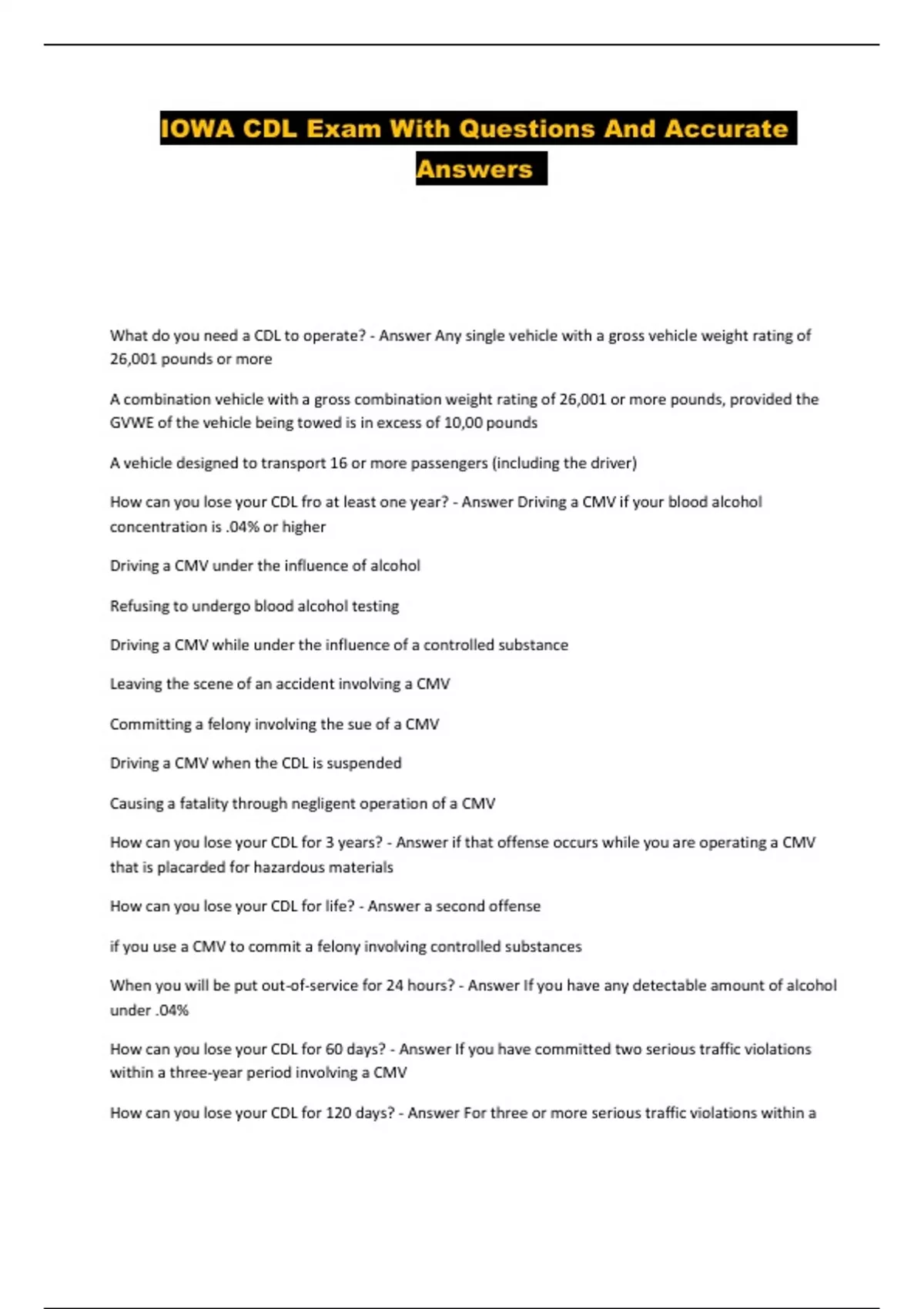 IOWA CDL Exam With Questions And Accurate Answers ...