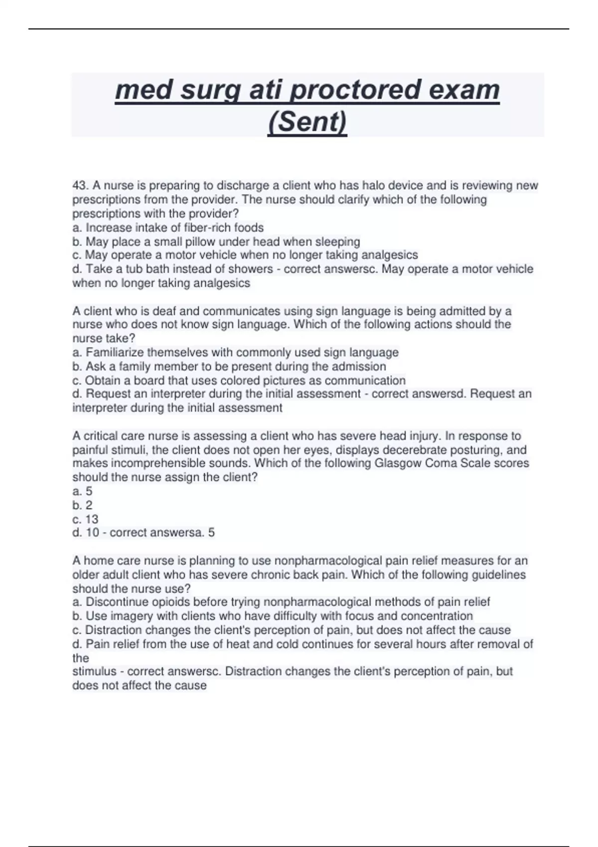 med surg ati proctored exam (Sent) 43. A nurse is preparing to discharge a client who has halo device and is reviewing new prescriptions from the provider. The nurse should clarify which of the following prescriptions with the provider? a. Increase intake of fiber-rich foods b. May place a small pillow under head when sleeping c. May operate a motor vehicle when no longer taking analgesics d. Take a tub bath instead of showers - correct answersc. May operate a motor vehicle when no longer taking analgesics A client who is deaf and communicates using sign language is being admitted by a nurse who does not know sign language. Which of the following actions should the nurse take? a. Familiarize themselves with commonly used sign language b. Ask a family member to be present during the admission c. Obtain a board that uses colored pictures as communication d. Request an interpreter during the initial assessment - correct answersd. Request an interpreter during the initial assessment A critical care nurse is assessing a client who has severe head injury. In response to painful stimuli, the