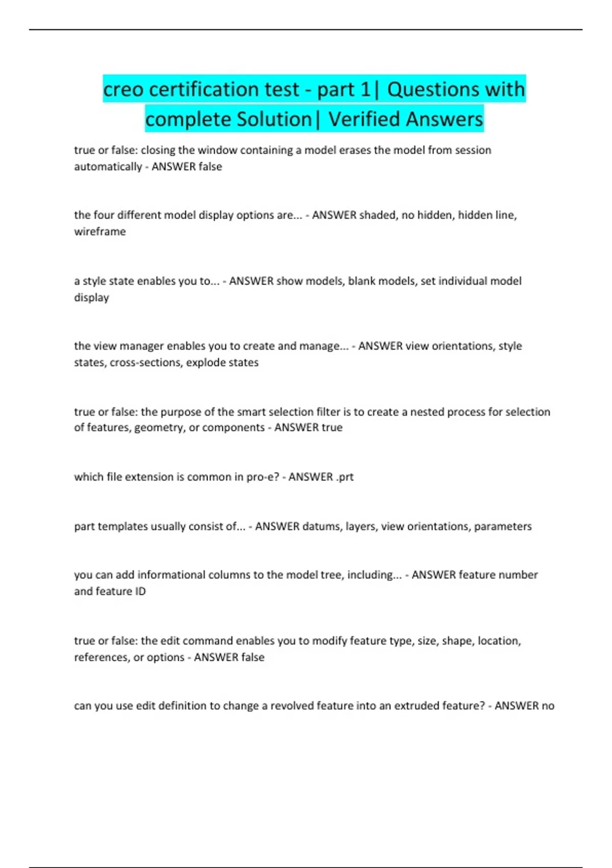 creo certification test - part 1| Questions with complete Solution| Verified Answers