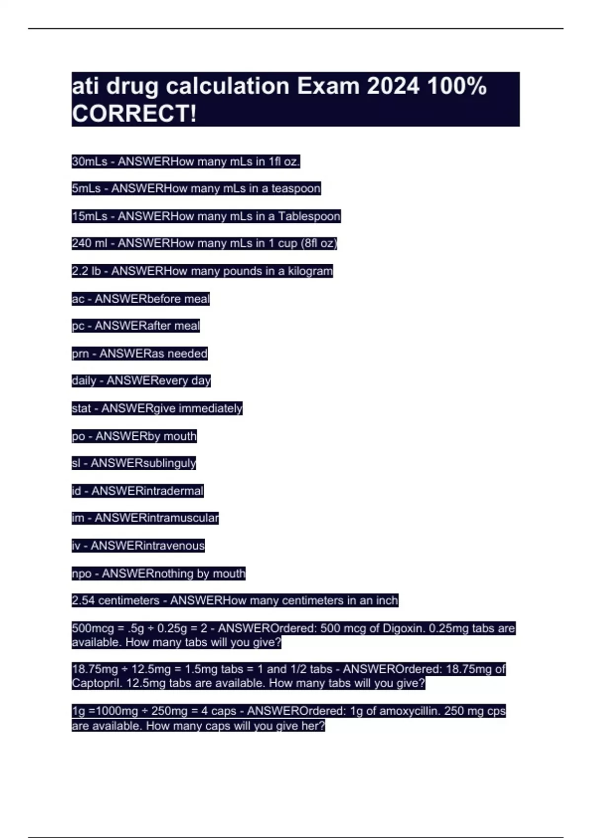 30mLs - ANSWERHow many mLs in 1fl oz. 5mLs - ANSWERHow many mLs in a teaspoon 15mLs - ANSWERHow many mLs in a Tablespoon 240 ml - ANSWERHow many mLs in 1 cup (8fl oz) 2.2 lb - ANSWERHow many pounds in a kilogram ac - ANSWERbefore meal pc - ANSWERafter meal prn - ANSWERas needed daily - ANSWERevery day stat - ANSWERgive immediately po - ANSWERby mouth sl - ANSWERsublinguly id - ANSWERintradermal im - ANSWERintramuscular iv - ANSWERintravenous npo - ANSWERnothing by mouth 2.54 centimeters - ANSWERHow many centimeters in an inch 500mcg = .5g ÷ 0.25g = 2 - ANSWEROrdered: 500 mcg of Digoxin. 0.25mg tabs are a