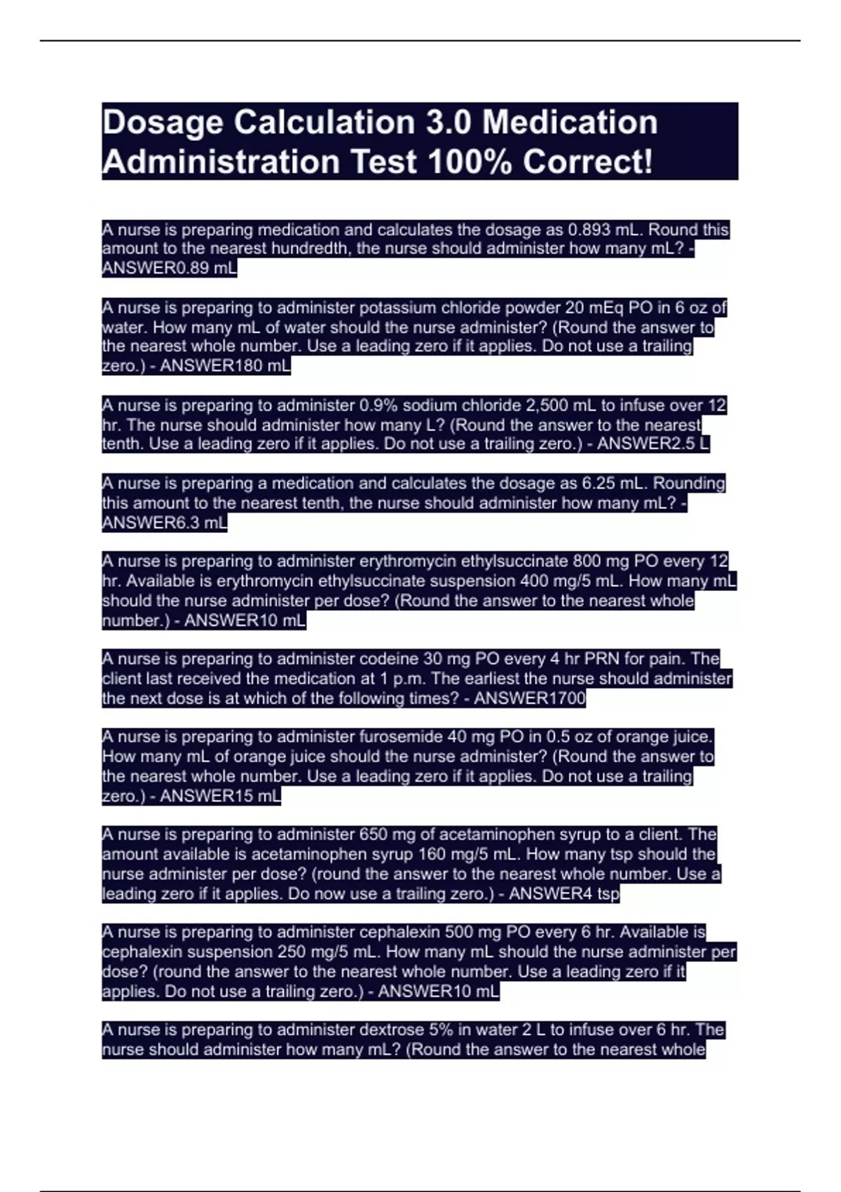 Dosage Calculation 3.0 Medication Administration Test 100% Correct!