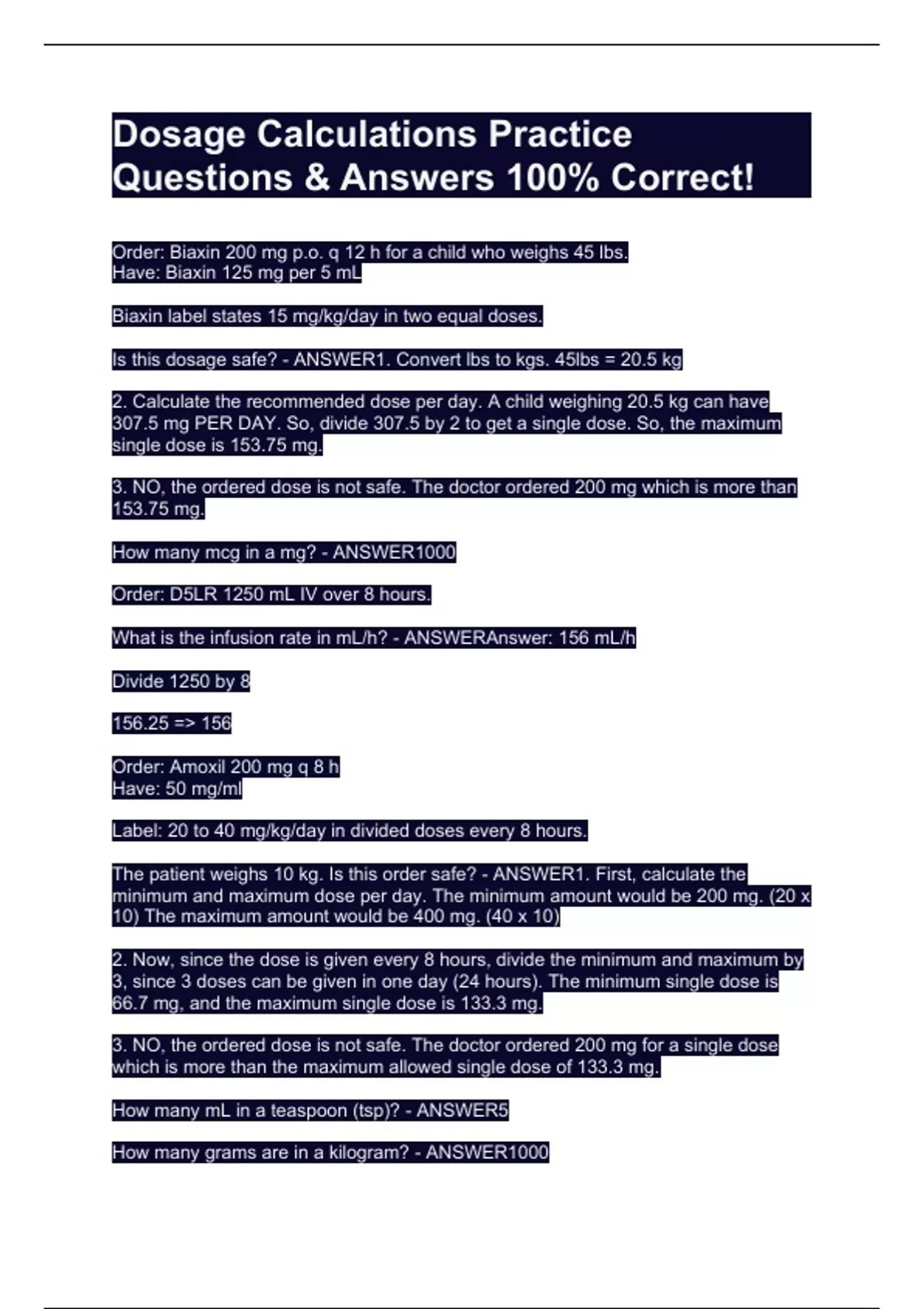 Order: Biaxin 200 mg p.o. q 12 h for a child who weighs 45 lbs. Have: Biaxin 125 mg per 5 mL Biaxin label states 15 mg/kg/day in two equal doses. Is this dosage safe? - ANSWER1. Convert lbs to kgs. 45lbs = 20.5 kg 2. Calculate the recommended dose per day. A child weighing 20.5 kg can have 307.5 mg PER DAY. So, divide 307.5 by 2 to get a single dose. So, the maximum single dose is 153.75 mg. 3. NO, the ordered dose is not safe. The doctor ordered 200 mg which is more than 153.75 mg. How many mcg in a mg? - ANSWER1000 Order: D5LR 1250 mL IV over 8 hours. What is the infusion rate in mL/h? - ANSWERAnswer: 156 mL/h Divide 1250 by 8 156.25 => 156 Order: Amoxil 200 mg q 8 h Have: 50 mg/ml Label: 20 to 40 mg/kg/day in divided doses every 8 hours. The patient weighs 10 kg. Is this order safe? - ANSWER1. First, calculate the minim