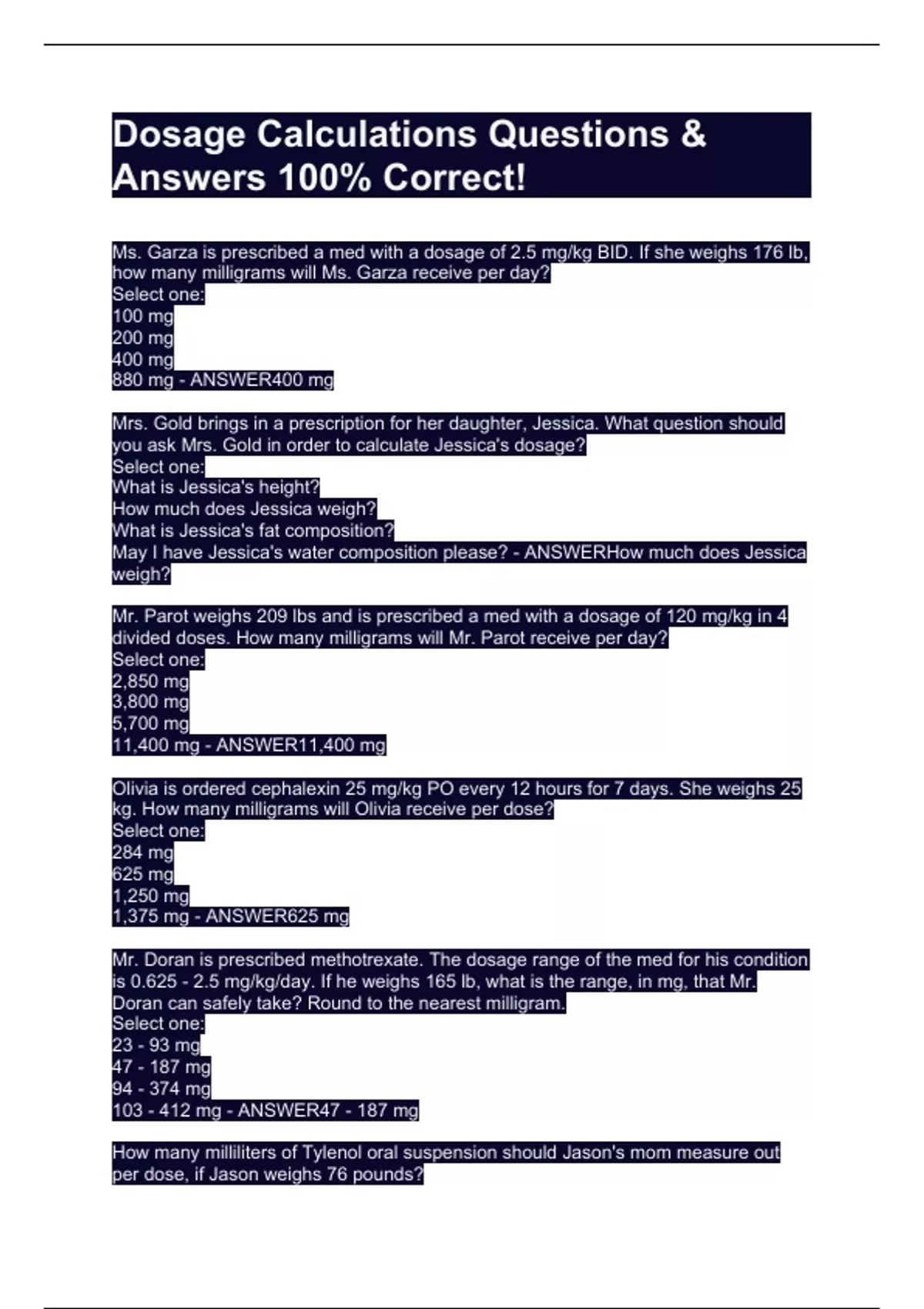 Ms. Garza is prescribed a med with a dosage of 2.5 mg/kg BID. If she weighs 176 lb, how many milligrams will Ms. Garza receive per day? Select one: 100 mg 200 mg 400 mg 880 mg - ANSWER400 mg Mrs. Gold brings in a prescription for her daughter, Jessica. What question should you ask Mrs. Gold in order to calculate Jessica's dosage? Select one: What is Jessica's height? How much does Jessica weigh? What is Jessica's fat composition? May I have Jessica's water composition please? - ANSWERHow much does Jessica weigh? Mr. Parot weighs 209 lbs and is prescribed a med with a dosage of 120 mg/kg in 4 divided doses. How many milligrams will Mr. Parot receive per day? Select one: 2,850 mg 3,800 mg 5,700 mg 11,400 mg - ANSWER11,400 mg Olivia is ordered cephalexin 25 mg/kg PO every 12 hours for 7 days. She weighs 25 kg. How many milligrams will Olivia receive per dose? Select one: 284 mg 625 mg 1,250 mg 1,375 mg - ANSWER625 mg