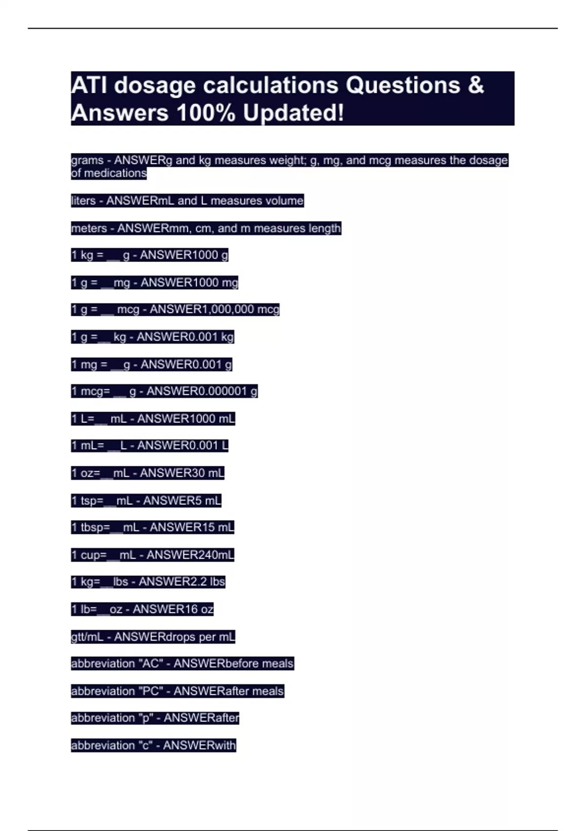 grams - ANSWERg and kg measures weight; g, mg, and mcg measures the dosage of medications liters - ANSWERmL and L measures volume meters - ANSWERmm, cm, and m measures length 1 kg = __ g - ANSWER1000 g 1 g = __mg - ANSWER1000 mg 1 g = __ mcg - ANSWER1,000,000 mcg 1 g =__ kg - ANSWER0.001 kg 1 mg = __g - ANSWER0.001 g 1 mcg= __ g - ANSWER0.000001 g 1 L=__ mL - ANSWER1000 mL 1 mL= __L - ANSWER0.001 L 1 oz=__mL - ANSWER30 mL 1 tsp=__mL - ANSWER5 mL 1 tbsp=__mL - ANSWER15 mL 1 cup=__mL - ANSWER240mL 1 kg=__lbs - ANSWER2.2 lbs 1 lb=__oz - ANSWER16 oz gtt/mL - ANSWERdrops per mL abbreviation "AC" - ANSWERbefore meals abbreviation "PC" - ANSWERafter meals abbreviation "p" - ANSWERafter