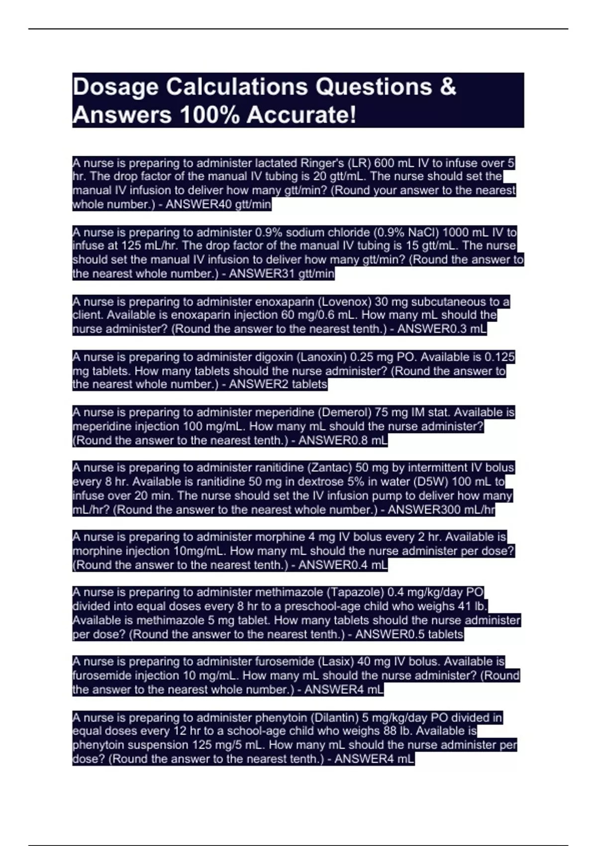 A nurse is preparing to administer lactated Ringer's (LR) 600 mL IV to infuse over 5 hr. The drop factor of the manual IV tubing is 20 gtt/mL. The nurse should set the manual IV infusion to deliver how many gtt/min? (Round your answer to the nearest whole number.) - ANSWER40 gtt/min A nurse is preparing to administer 0.9% sodium chloride (0.9% NaCl) 1000 mL IV to infuse at 125 mL/hr. The drop factor of the manual IV tubing is 15 gtt/mL. The nurse should set the manual IV infusion to deliver how many gtt/min? (Round the answer to the nearest whole number.) - ANSWER31 gtt/min A nurse is preparing to administer enoxaparin (Lovenox) 30 mg subcutaneous to a client. Available is enoxaparin injection 60 mg/0.6 mL. How many mL should the nurse administer? (Round the answer to the nearest tenth.) - ANSWER0.3 mL A nurse is preparing to administer digoxin (Lanoxin) 0.25 mg PO. Available is 0.125 mg tablets. How many tablets should the nurse administer? (Round the answer to the nearest whole number.) - ANSWER2 tablets A nurse is preparing to administer meperidine (Demerol) 75 mg IM stat. Available is meperidine injection 100 mg/mL. How many mL should the nurse administer? (Round the answer to the nearest tenth.) - ANSWER0.8 mL A nurse is preparing to administer ranitidine (Zantac) 50 mg by intermittent IV bolus every 8 hr. Available is ranitidine 50 mg in dextrose 5% in water (D5W) 100 mL to infuse over 20 min. The nurse should set the IV infusion pump to deliver how many mL/hr? (Round the answer to the nearest whole number.) - ANSWER300 mL/hr A nurse is preparing to administer morphine 4 mg IV bolus every 2 hr. Available is morphine injection 10mg/mL. How many mL should the nurse administer per dose? (Round the answer to the nearest tenth.) - ANSWER0.4 mL