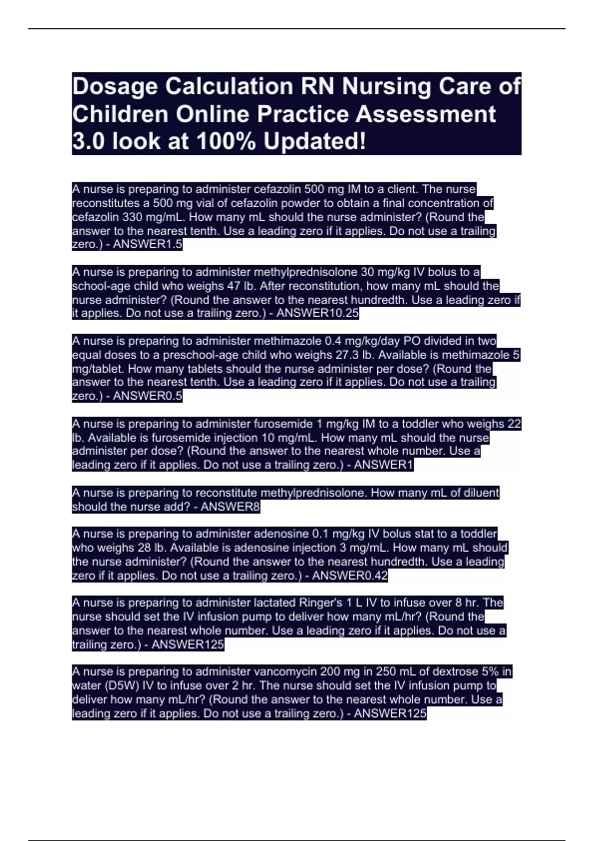 Dosage Calculation RN Nursing Care of Children Online Practice Assessment 3.0 look at 100% Updated!