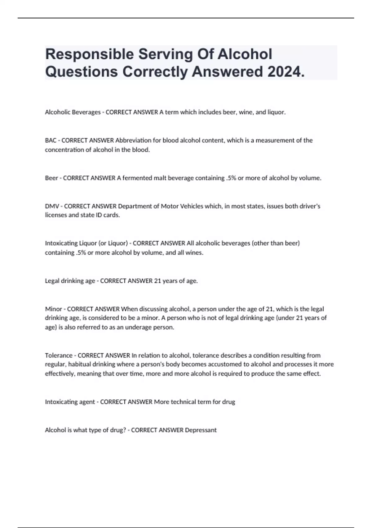 Responsible Serving Of Alcohol Questions Correctly Answered & Verified. Alcoholic Beverages - CORRECT ANSWER A term which includes beer, wine, and liquor. BAC - CORRECT ANSWER Abbreviation for blood alcohol content, which is a measurement of the concentration of alcohol in the blood. Beer - CORRECT ANSWER A fermented malt beverage containing .5% or more of alcohol by volume. DMV - CORRECT ANSWER Department of Motor Vehicles which, in most states, issues both driver's licenses and state ID cards. Intoxicating Liquor (or Liquor) - CORRECT ANSWER All alcoholic beverages (other than beer) containing .5% or more alcohol by volume, and all wines. Legal drinking age - CORRECT ANSWER 21 years of age. Minor - CORRECT ANSWER When discussing alcohol, a person under the age of 21, which is the legal drinking age, is considered to be a minor. A person who is not of legal drinking age (under 21 years of age) is also referred to as an underage person. Tolerance - CORRECT ANSWER In relation to alcohol, tolerance describes a condition resulting from regular, habitual drinking where a person's body becomes accustomed to alcohol and processes it more effectively, meaning that over time, more and more alcohol is required to produce the same effect. Intoxicating agent - CORRECT ANSWER More technical term for drug Alcohol is what type of drug? - CORRECT ANSWER Depressant What does alcohol affect? - CORRECT ANSWER central nervous system BAC expressed as a percentage: - CORRECT ANSWER A widely accepted estimate of BAC is two standard drinks consumed in one hour result in a BAC of approximately 0.04%. Further consumption of one drink per hour will sustain that level.