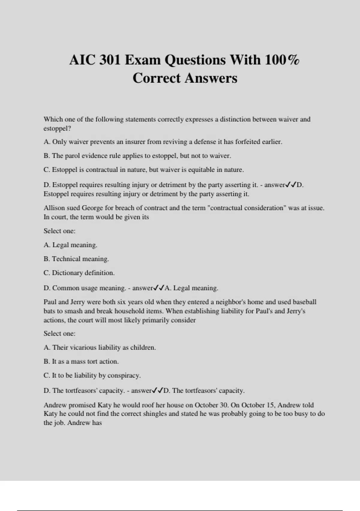 AIC 301 Exam Questions With 100% Correct Answers Which one of the following statements correctly expresses a distinction between waiver and estoppel? A. Only waiver prevents an insurer from reviving a defense it has forfeited earlier. B. The parol evidence rule applies to estoppel, but not to waiver. C. Estoppel is contractual in nature, but waiver is equitable in nature. D. Estoppel requires resulting injury or detriment by the party asserting it. - answerD. Estoppel requires resulting injury or detriment by the party asserting it. Allison sued George for breach of contract and the term "contractual consideration" was at issue. In court, the term would be given its Select one: A. Legal meaning. B. Technical meaning. C. Dictionary definition. D. Common usage meaning. - answerA. Legal meaning. Paul and Jerry were both six years old when they entered a neighbor's home and used baseball bats to smash and break household items. When establishing liability for Paul's and Jerry's actions, the court will most likely primarily consider Select one: A. Their vicarious liability as children. B. It as a mass tort action. C. It to be liability by conspiracy. D. The tortfeasors' capacity. - answerD. The tortfeasors' capacity. Andrew promised Katy he would roof her house on October 30. On October 15, Andrew told Katy he could not find the correct shingles and stated he was probably going to be too busy to do the job. Andrew has