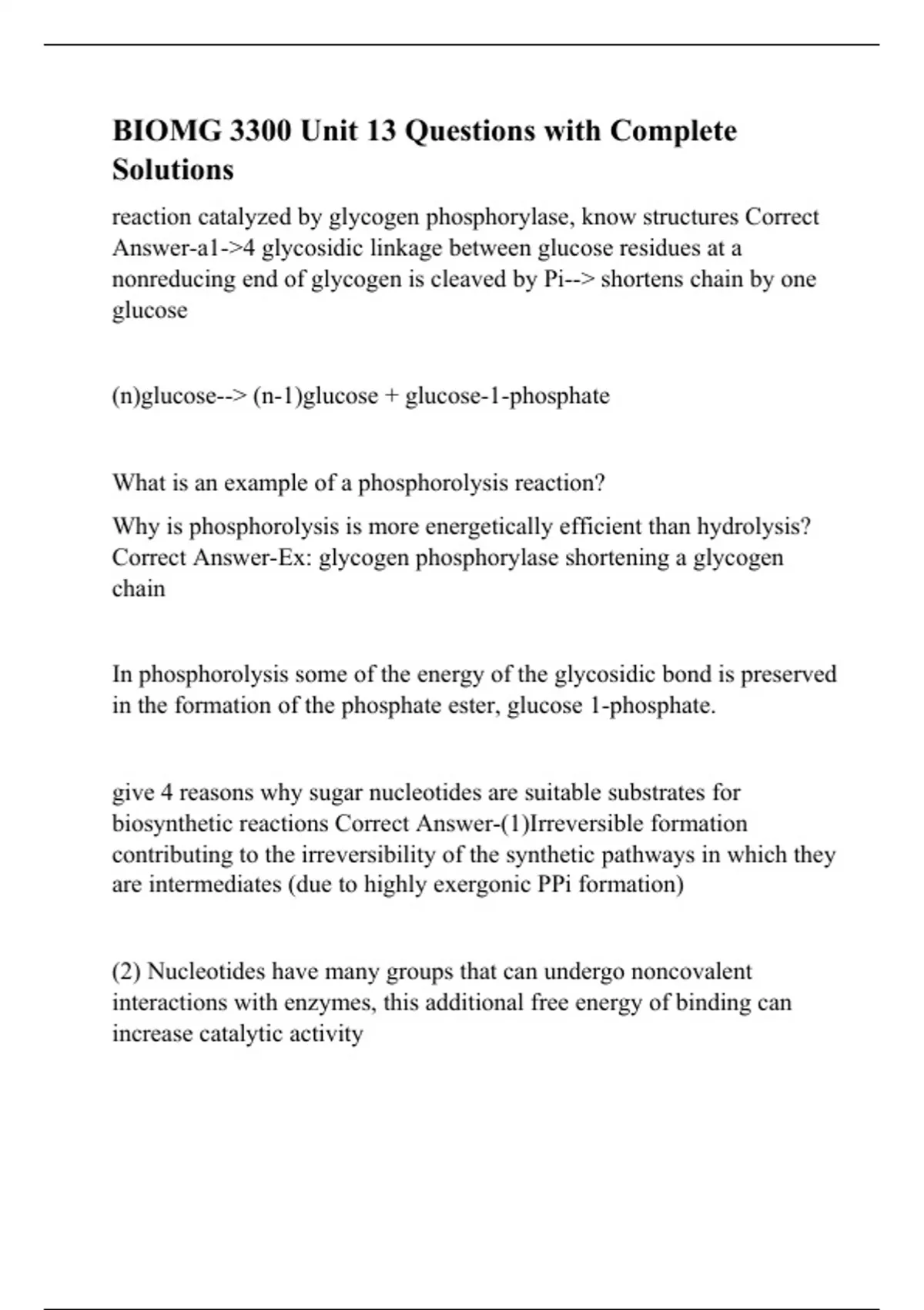 reaction catalyzed by glycogen phosphorylase, know structures Correct Answer-a1->4 glycosidic linkage between glucose residues at a nonreducing end of glycogen is cleaved by Pi--> shortens chain by one glucose (n)glucose--> (n-1)glucose + glucose-1-phosphate What is an example of a phosphorolysis reaction? Why is phosphorolysis is more energetically efficient than hydrolysis? Correct Answer-Ex: glycogen phosphorylase shortening a glycogen chain In phosphorolysis some of the energy of the glycosidic bond is preserved in the formation of the phosphate ester, glucose 1-phosphate. give 4 reasons why sugar nucleotides are suitable substrates for biosynthetic reactions Correct Answer-(1)Irreversible formation contributing to the irreversibility of the synthetic pathways in which they are intermediates (due to highly exergonic PPi formation) (2) Nucleotides have many groups that can undergo noncovalent interactions with enzymes, this additional free energy of binding can increase catalytic activity