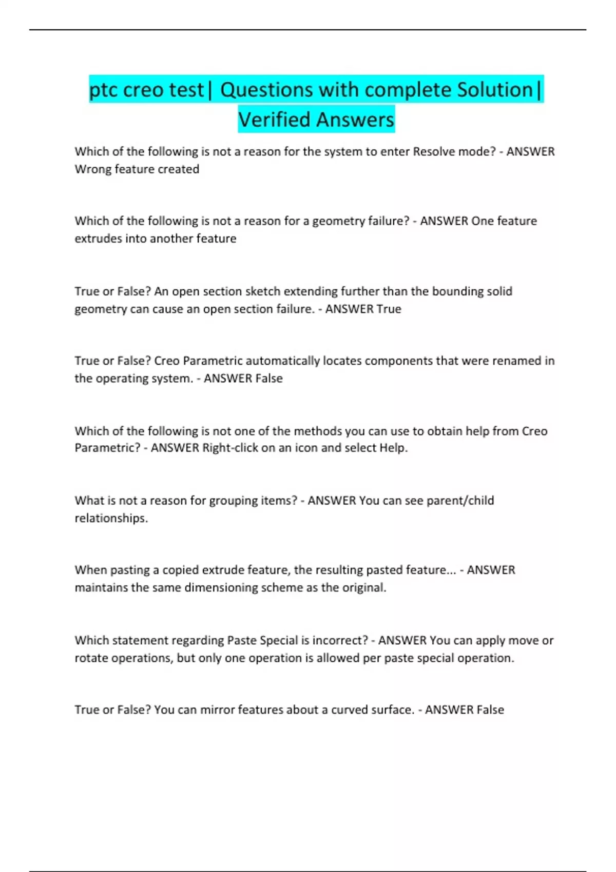 ptc creo test| Questions with complete Solution| Verified Answers