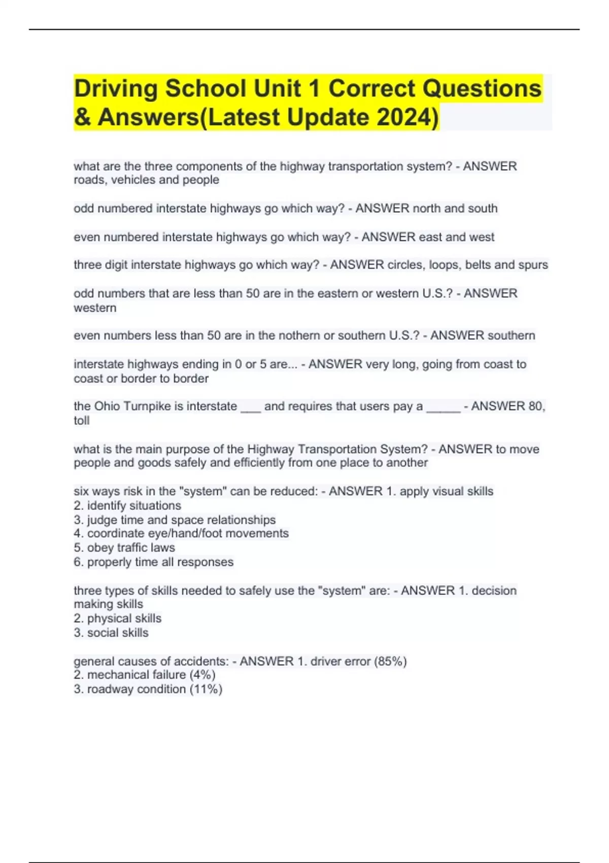 Driving School Unit 1 Correct Questions & Answers(Latest Update 2024)