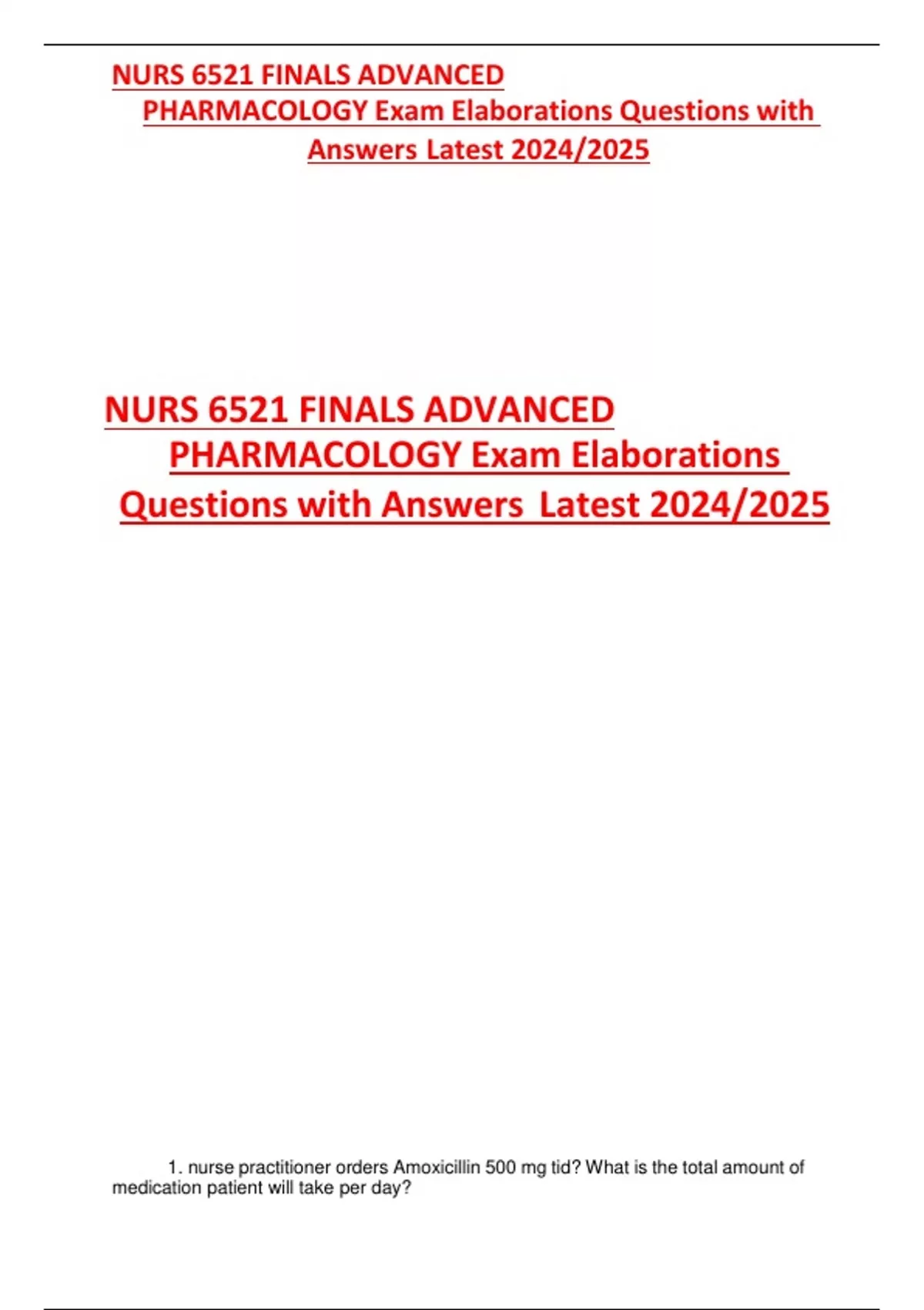 . nurse practitioner orders Amoxicillin 500 mg tid? What is the total amount of medication patient will take per day? NURS 6521 FINALS ADVANCED PHARMACOLOGY Exam Elaborations Questions with Answers Graded A+ Selected Answer: 1500 mg 2.A 72-year-old patient is prescribed ophthalmic ciprofloxacin for a bacterial infection in her right eye. The nurse will teach her to observe for which of the following adverse effects ofthe drug? Selected Answer: Lid margin crusting and pruritus 3.A patient is to begin taking tobramycin (Nebcin) for a nosocomial infection. Which of thefollowing assessments should the nurse prioritize? Selected Answer: The peak and trough blood levels 4.A Nurse Practitioner is caring for a 64-year-old female patient who is receiving IV heparinand reports bleeding from her gums. The nurse checks the patient's laboratory test results and finds that she has a very high aPTT. The nurse anticipates that which of the following drugs maybe ordered? Selected Answer: Protamine sulfate 5.A patient asks the nurse practitioner about food sources such as soybeans and soyproducts. The nurse practitioner understands that these foods are considered Selected Answer: phytoestrogens. 6.An immunocompromised cancer patient has developed cryptococcal meningitis and been admitted to the intensive care unit for treatment with amphotericin B. How should thenurse most safely administer this drug? Selected Answer: Infuse the drug over 2 to 4 hours into a central line using aninfusion pump 7.The clinical nurse educator who oversees the emergency department in a children's hospital has launched a