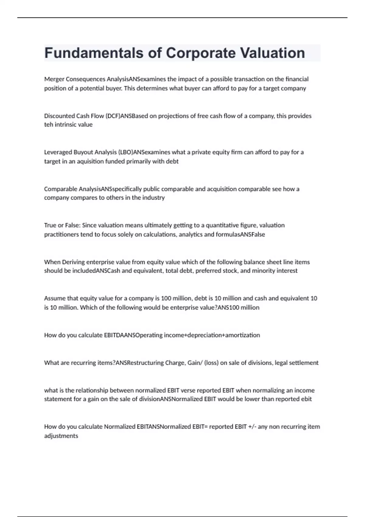 Fundamentals of Corporate Valuation Exam Study Questions With Correct Answers (RATED 100%)