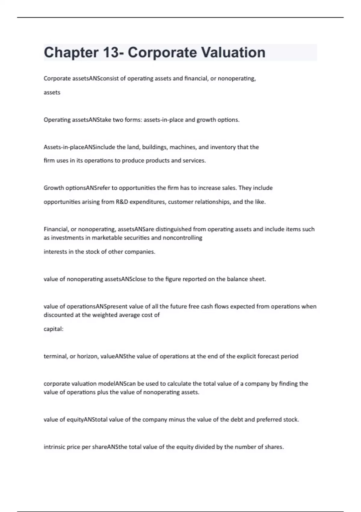 Chapter 13- Corporate Valuation Exam Both Questions And Answers ( SOLVED 100%)