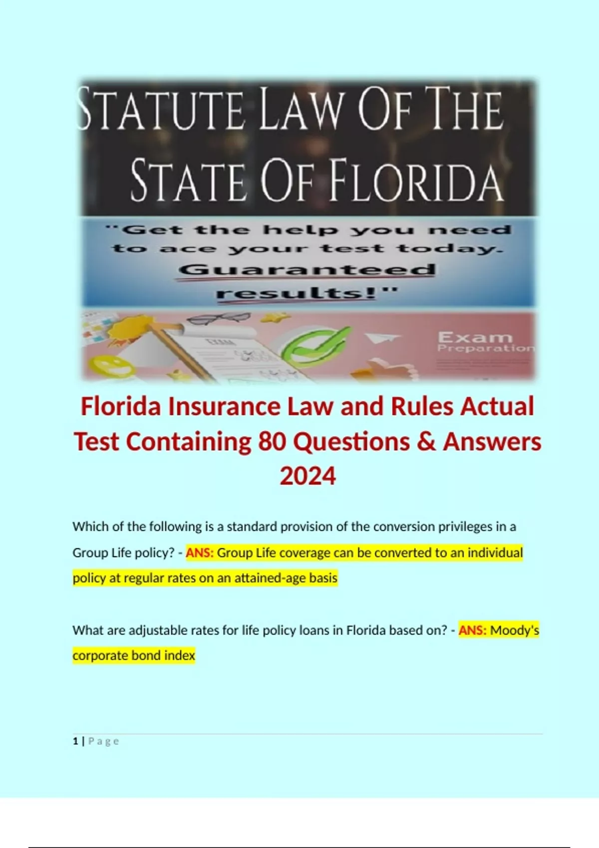 Florida Insurance Law and Rules Actual Test Containing 80 Questions & Answers 2024