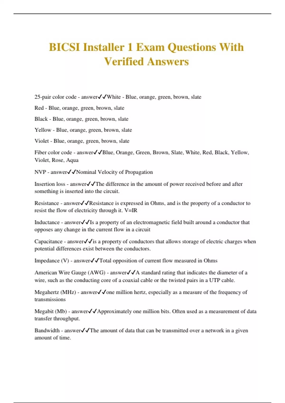 BICSI Installer 1 Exam Questions With Verified Answers 25-pair color code - answerWhite - Blue, orange, green, brown, slate Red - Blue, orange, green, brown, slate Black - Blue, orange, green, brown, slate Yellow - Blue, orange, green, brown, slate Violet - Blue, orange, green, brown, slate Fiber color code - answerBlue, Orange, Green, Brown, Slate, White, Red, Black, Yellow, Violet, Rose, Aqua NVP - answerNominal Velocity of Propagation Insertion loss - answerThe difference in the amount of power received before and after something is inserted into the circuit. Resistance - answerResistance is expressed in Ohms, and is the property of a conductor to resist the flow of electricity through it. V=IR Inductance - answerIs a property of an electromagnetic field built around a conductor that opposes any change in the current flow in a circuit Capacitance - answeris a property of conductors that allows storage of electric charges when potential differences exist between the conductors. Impedance (V) - answerTotal opposition of current flow measured in Ohms American Wire Gauge (AWG) - answerA standard rating that indicates the diameter of a wire, such as the conducting core of a coaxial cable or the twisted pairs in a UTP cable. Megahertz (MHz) - answerone million hertz, especially as a measure of the frequency of transmissions Megabit (Mb) - answerApproximately one million bits. Often used as a measurement of data transfer throughput. Bandwidth - answerThe amount of data that can be transmitted over a network in a given amount of time. Decibel (dB) - answerA unit used to compare the loudness of different sounds. Crosstalk - answerwhen data bleeds from one pair to another in a cable Alien Crosstalk (AXT) - answerUnwanted signal coupling from one permanent link to another USOC - answerUniversal Service Order Code Coaxial cable types - answerSeries-6 and Series-11 Coaxial connectors - answerSeries-6 uses BNC and F connectors Series-11 uses F and N connectors Fiber connectors - answerSC, ST, and SST(LC or cladding - answerThe glass or plastic shield around the core of a fiber-optic cable. Cladding reflects light back to the core in patterns that vary depending on the transmission mode. This reflection allows fiber to bend around corners without impairing the light-based signal. Multimode Fiber (MMF) - answerLarger core with multiple paths of light. Common for backbone and horizontal cabling in buildings. OM2 - Not recommended for new installs. OM3 - Higher bandwidth. OM4 - Highest bandwidth for MMF. 2000m/6500ft limitation. 850 nm and 1300 nm (nanometers) Singlemode Fiber - answerSmaller core with only one path of lights. Horizontal, riser, campus environments. 9 um core, 125 um cladding. OS1 - LAN, tight buffered construction, 1310/1550 nm OS2 - Outside Plant, 1310, 1490, 1550, 1625 nm 3000m/9842ft limtations. Ribbon Fiber - answerMultiple 250 um fibers bonded into a flat color coded ribbon. Can splice a bunch at a time. Fiber - Tight buffer diameter - answer900 um Fiber - Acrylate coating diameter - answer250 um OM1 - answer850 nm OFL - 200 MHz•km (3.5dB/km) 1300 nm - 400 MHz•km (1.5dB/km) OM2 - answer850 nm OFL - 500MHz•km (3.5dB/km)
