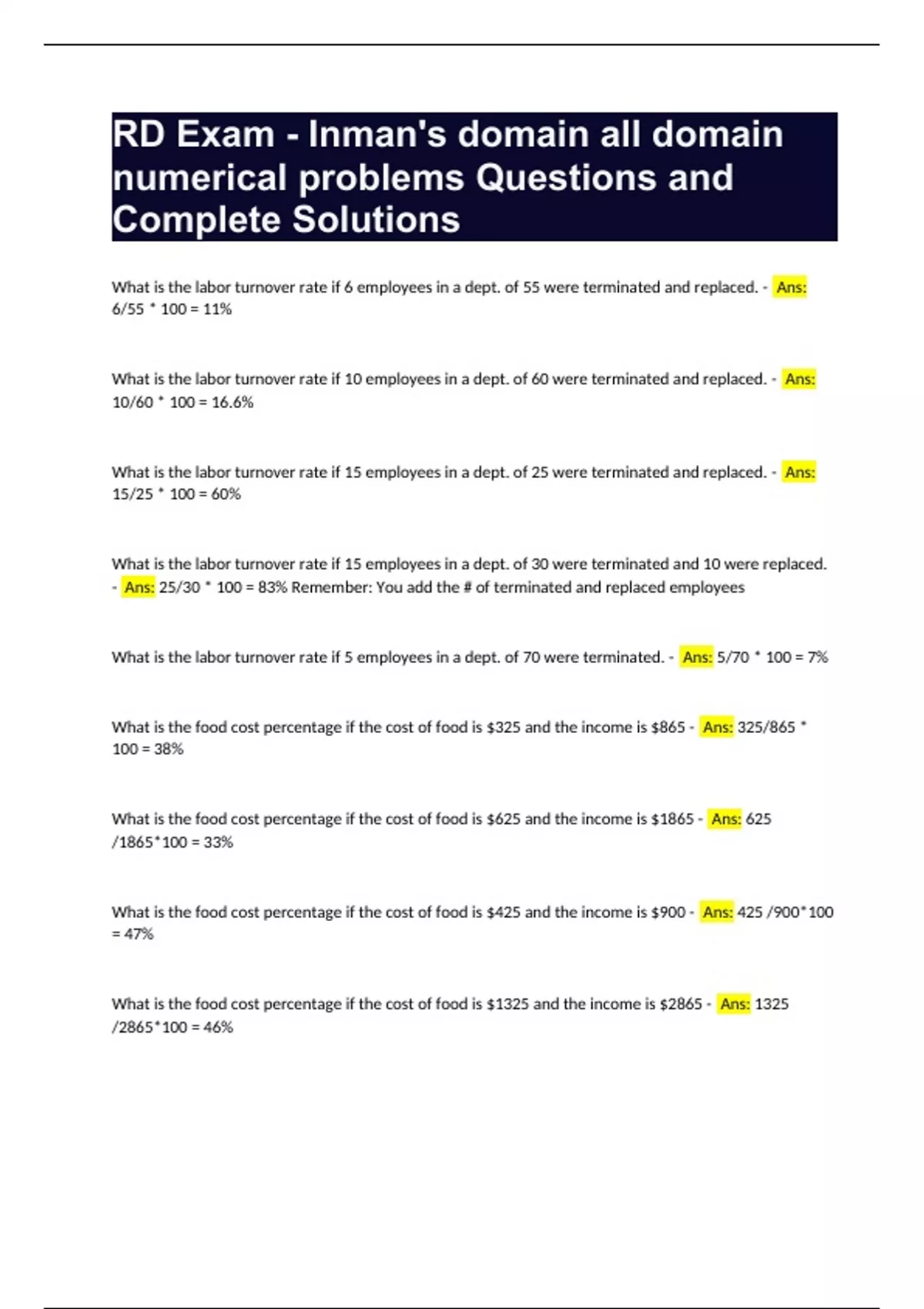 RD Exam - Inman's domain all domain numerical problems Questions and Complete Solutions.