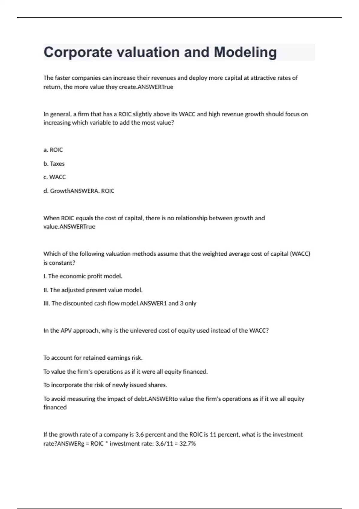 Corporate valuation and Modeling Exam Questions And Answers (VERIFIED ANSWERS )